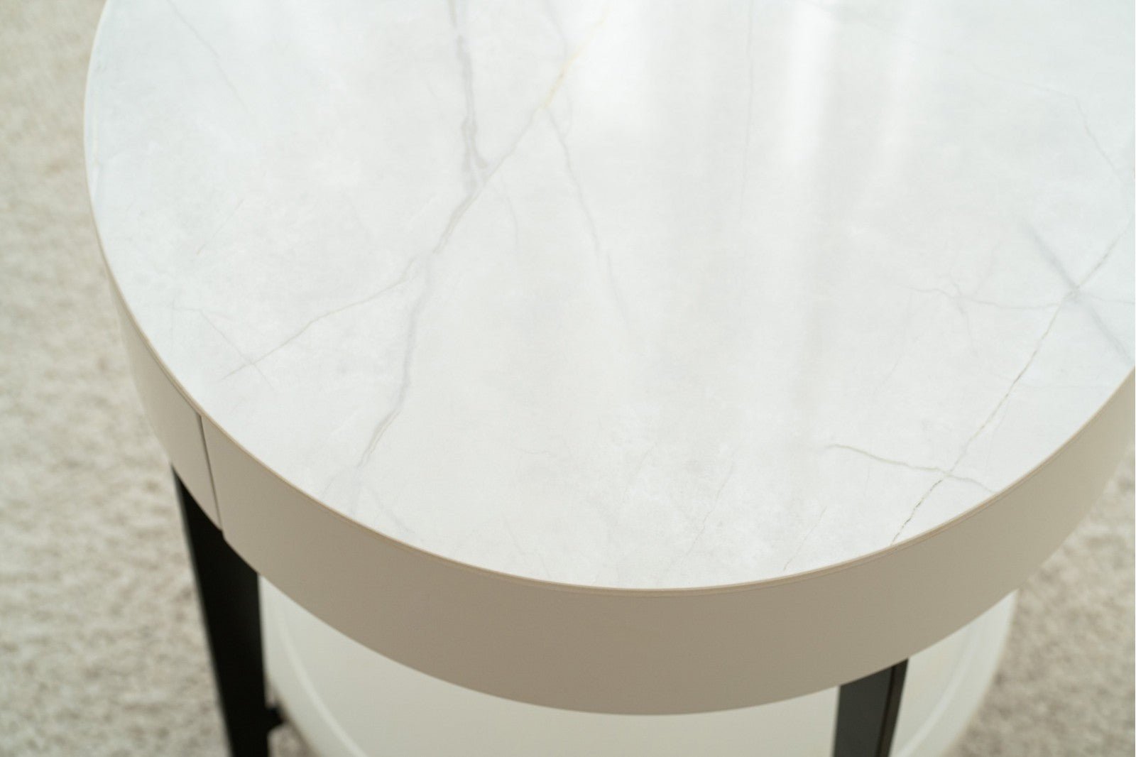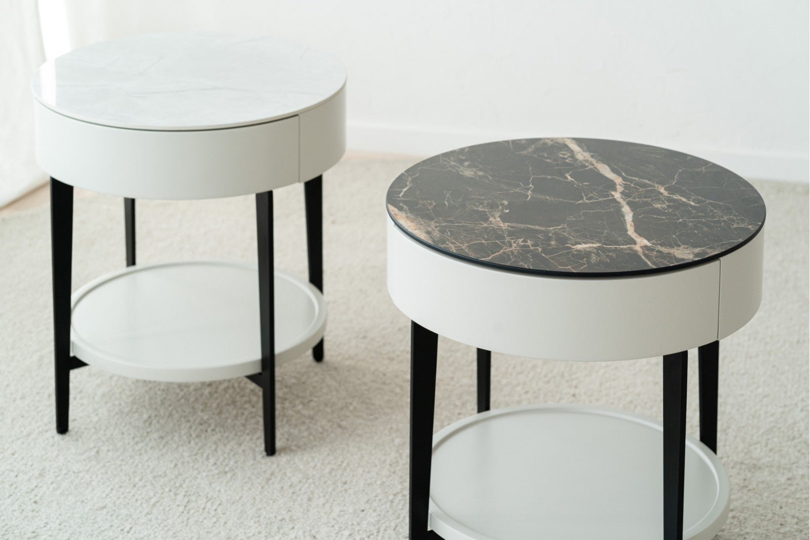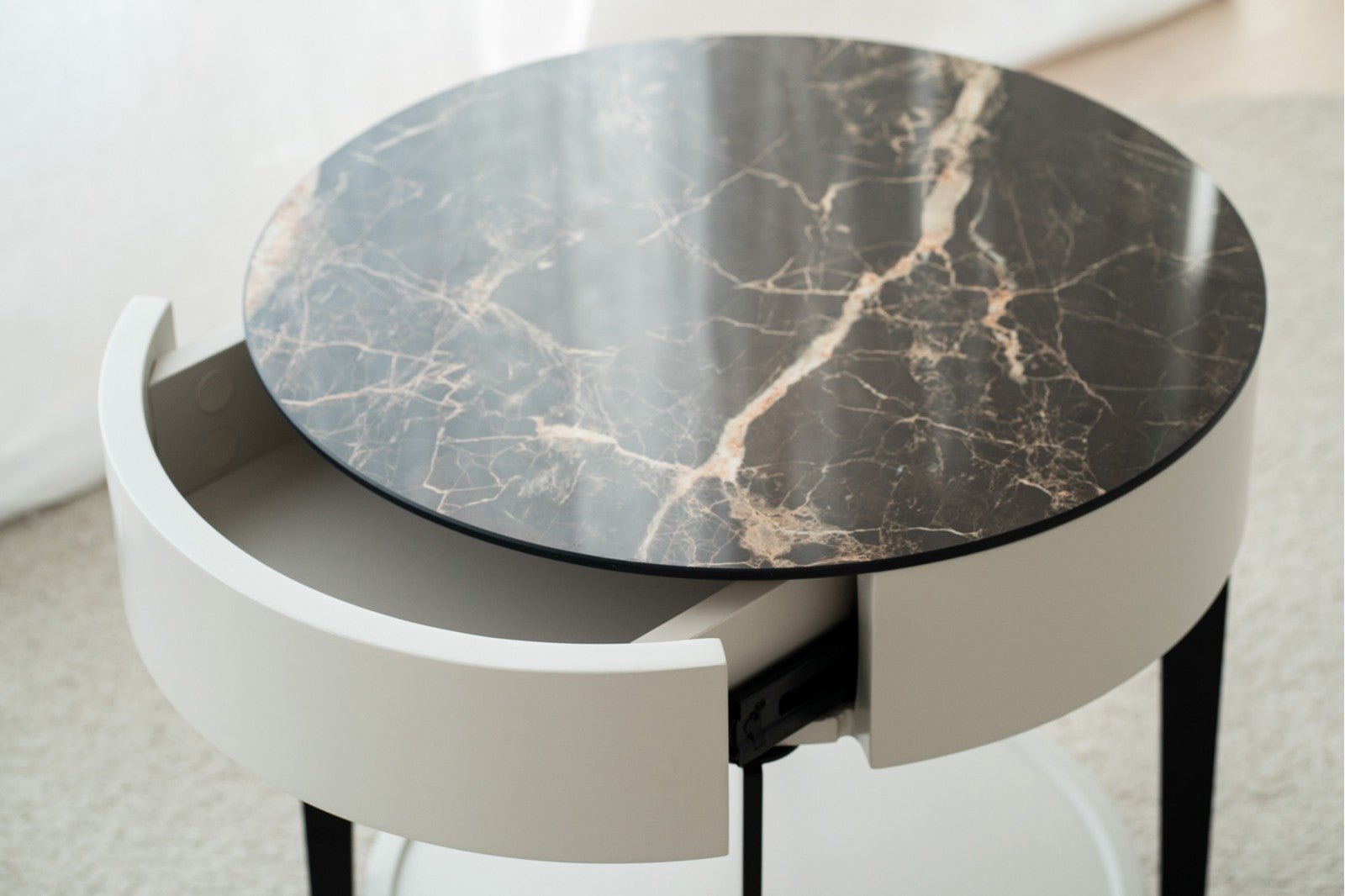 A rounded side table made of a black metal frame with a matte finish and a ceramic marble top in white, grey or brown and beige tones. The table body is made of MDF lacquered in a sandy grey tone with a matte finish and has a practical drawer and a lower shelf.