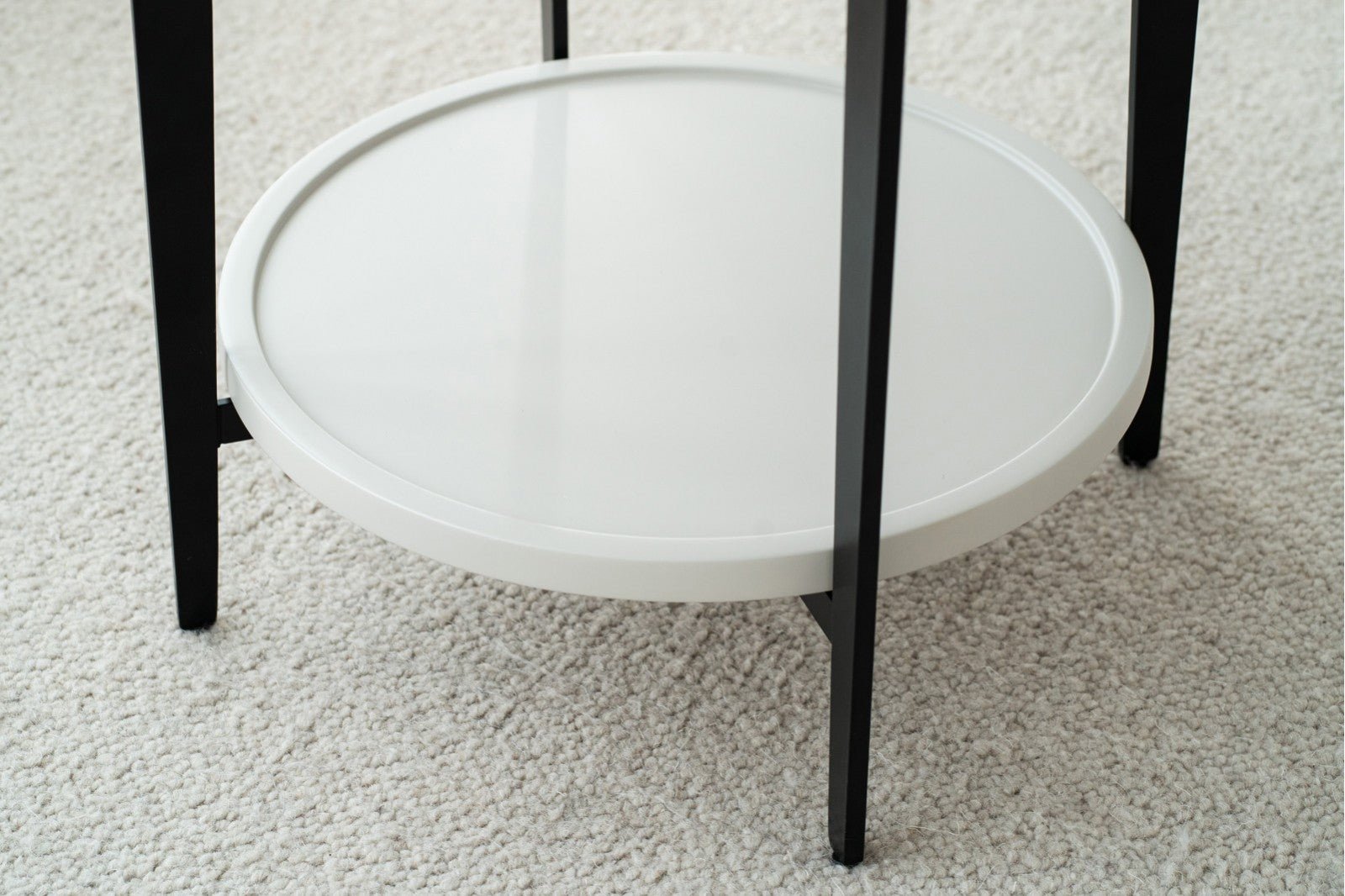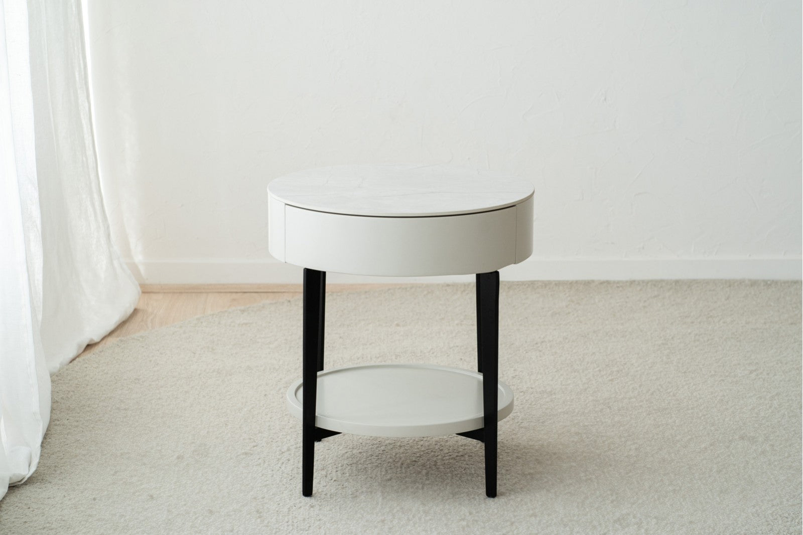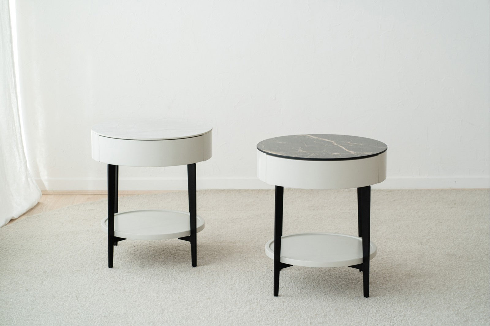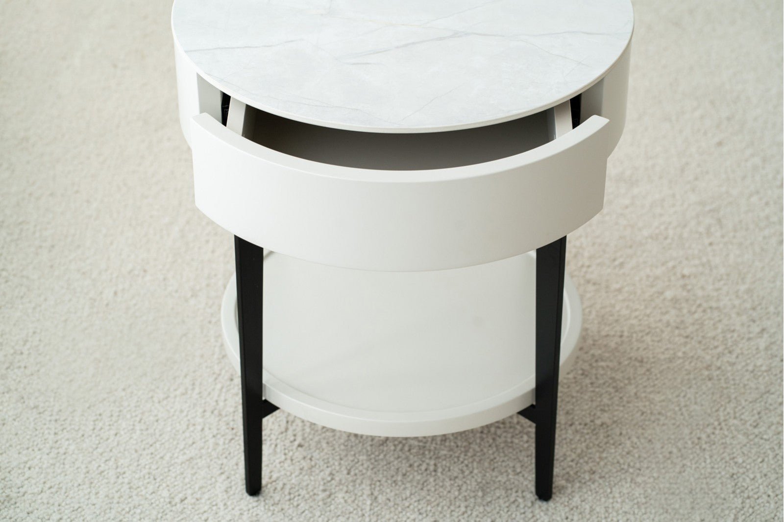 A rounded side table made of a black metal frame with a matte finish and a ceramic marble top in white, grey or brown and beige tones. The table body is made of MDF lacquered in a sandy grey tone with a matte finish and has a practical drawer and a lower shelf.
