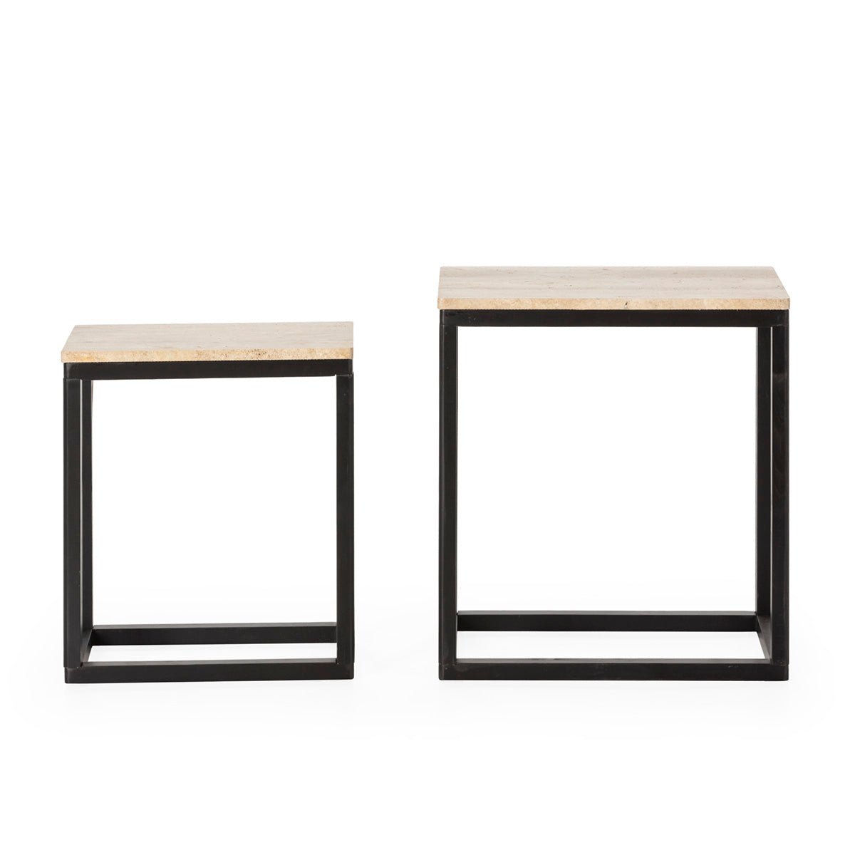 Beautiful set of 2 rectangular side tables with a base made of black pine wood and a travertine marble top.
