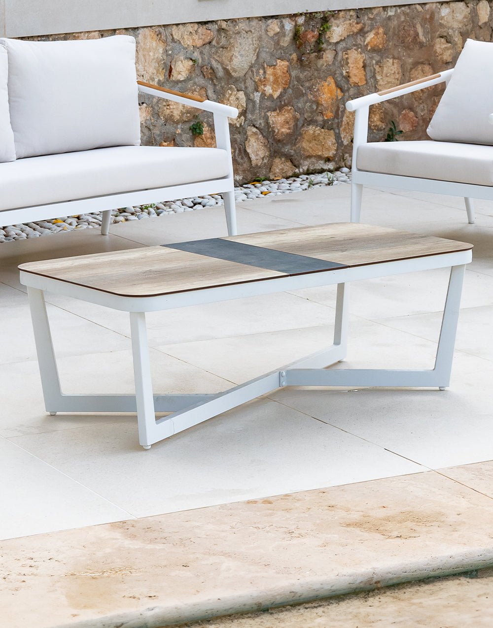 Outdoor coffee table made of white aluminium and imitation wood top.