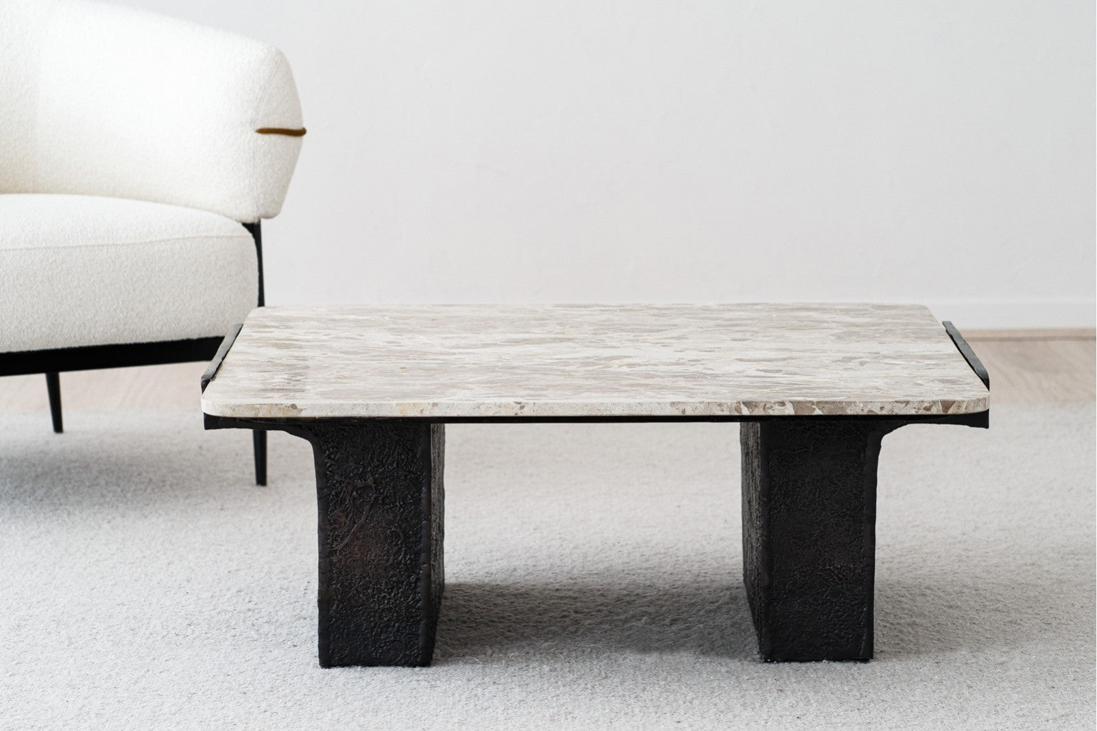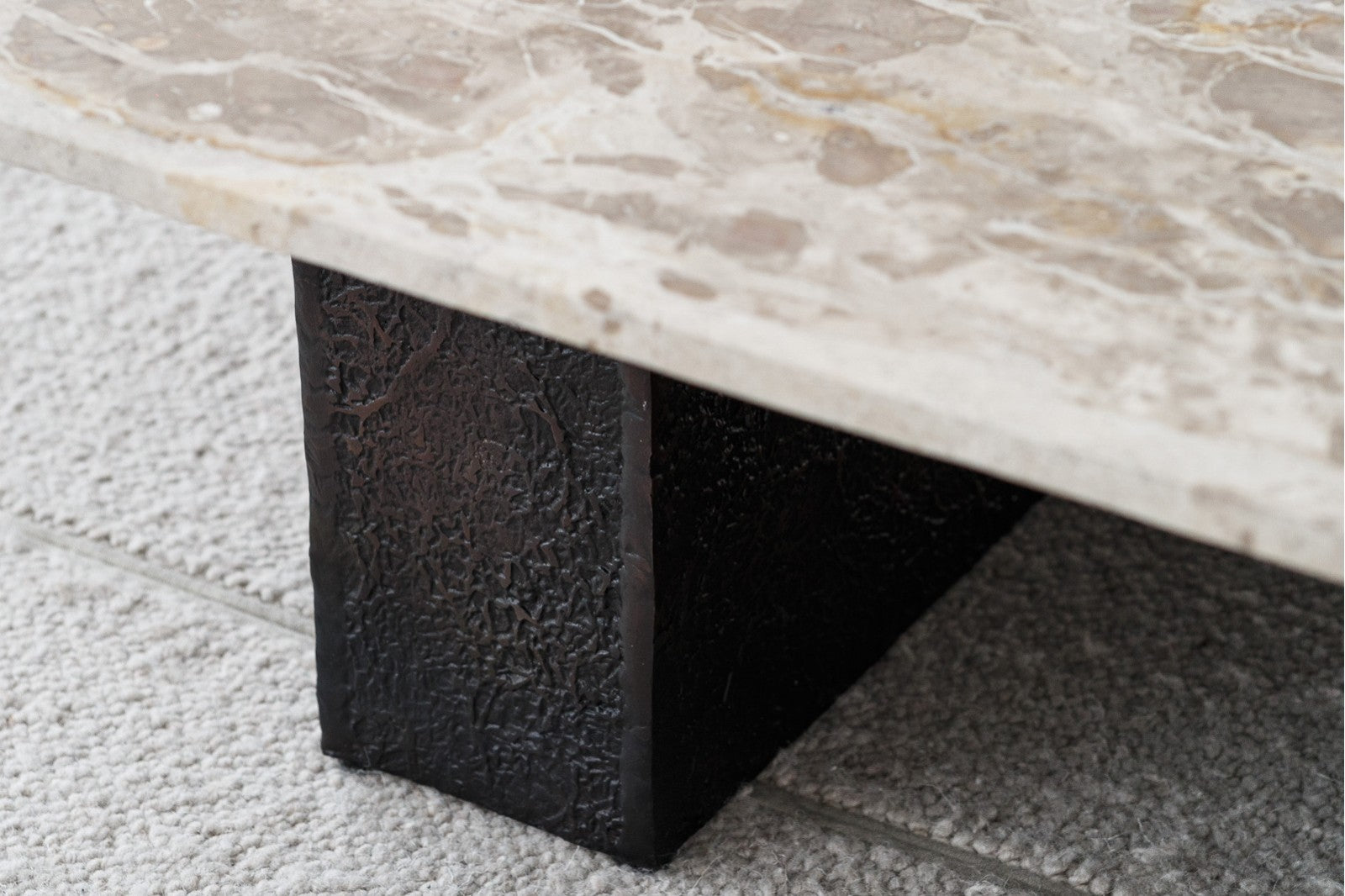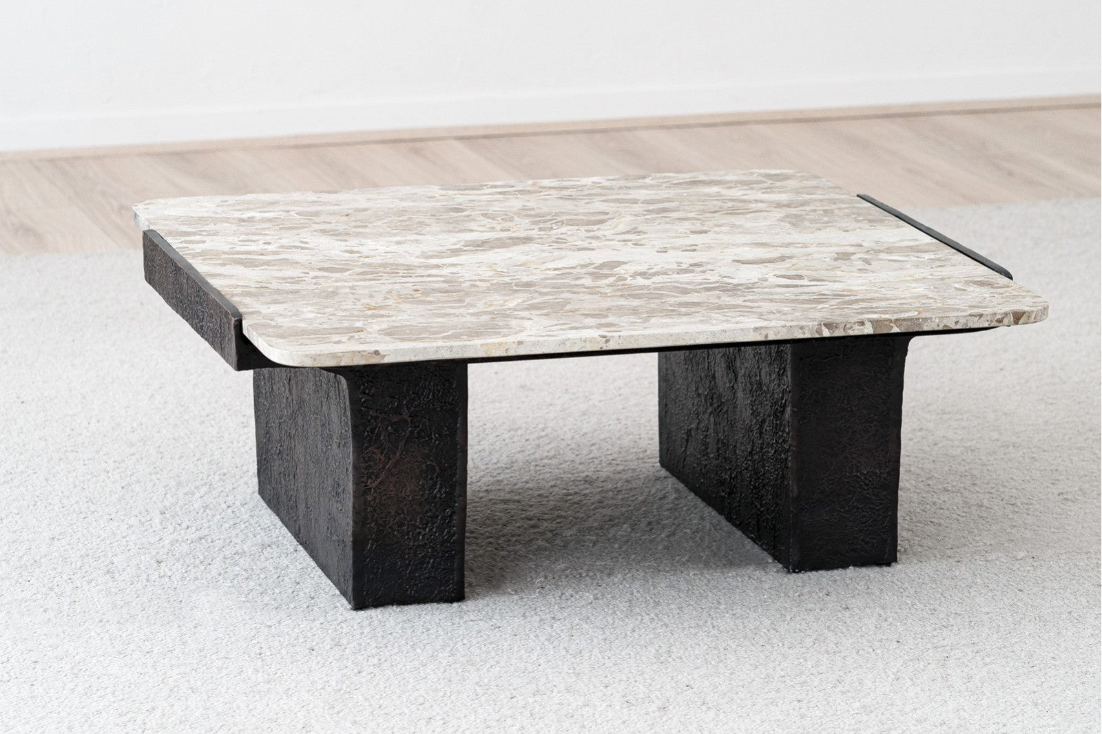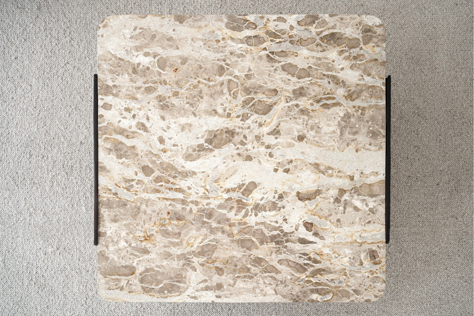 Square coffee table with black metal legs and top made of black synthetic stone with ochre-coloured veins.