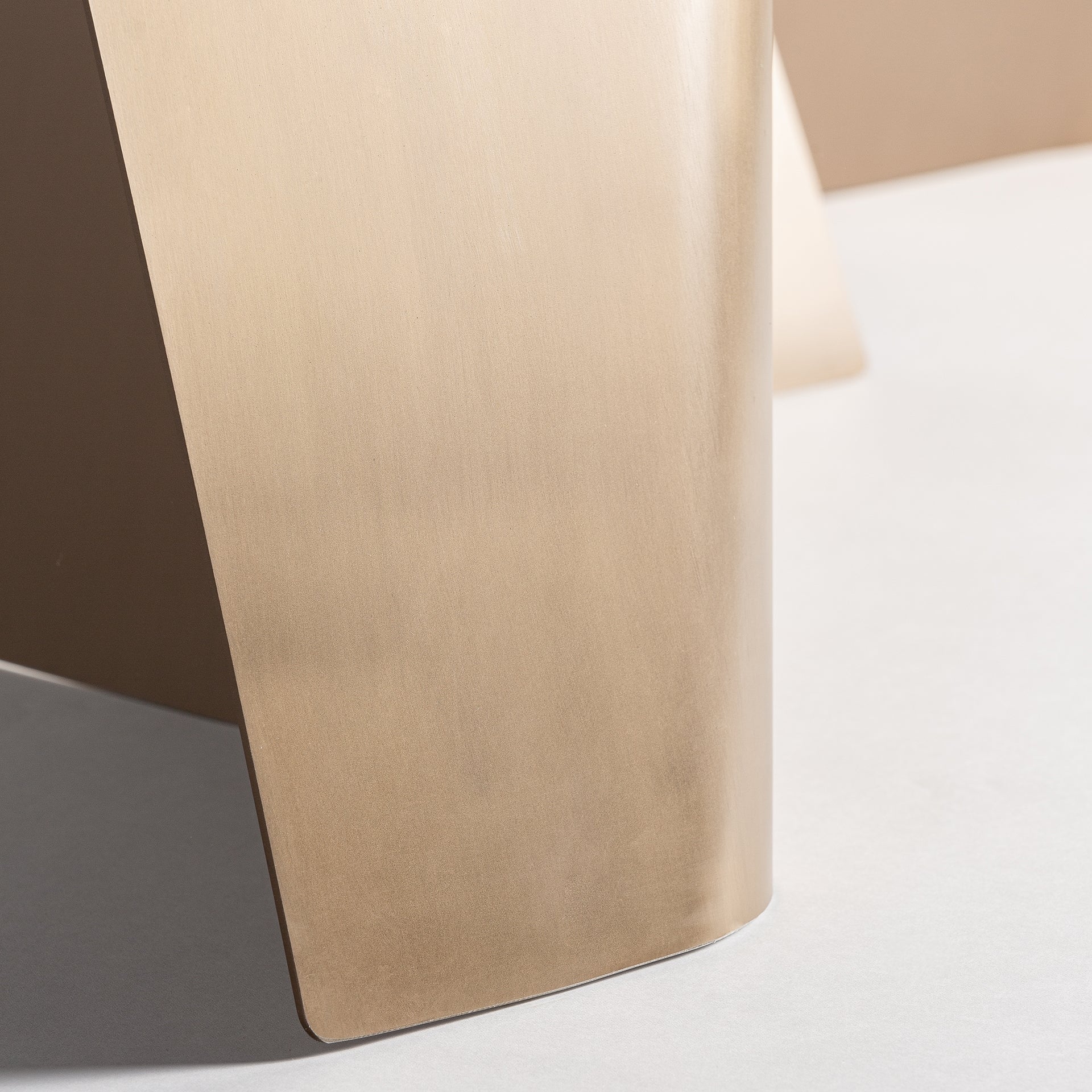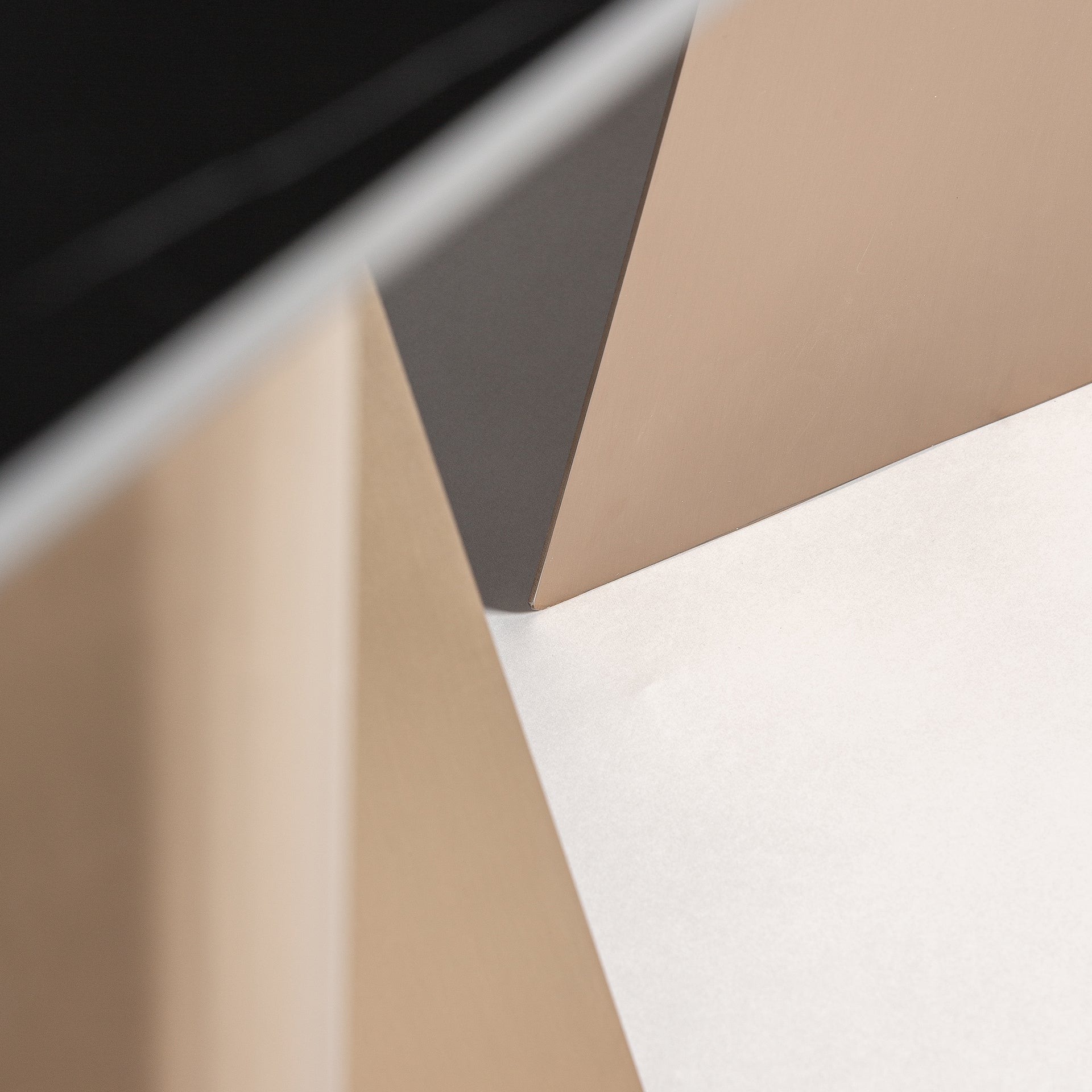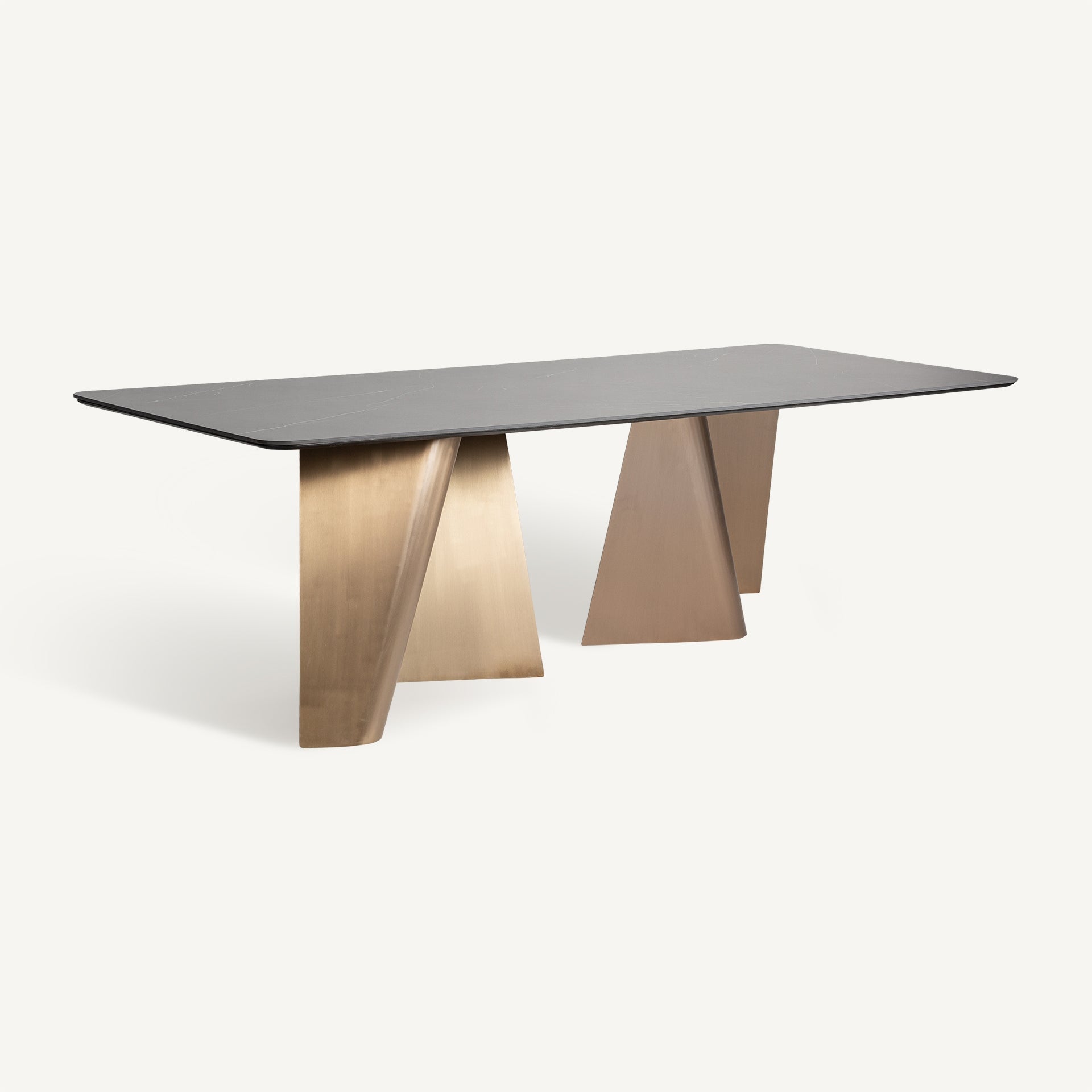Dining table with a porcelain top in a rich black and gold colour combination with gold-coloured steel leg structure.