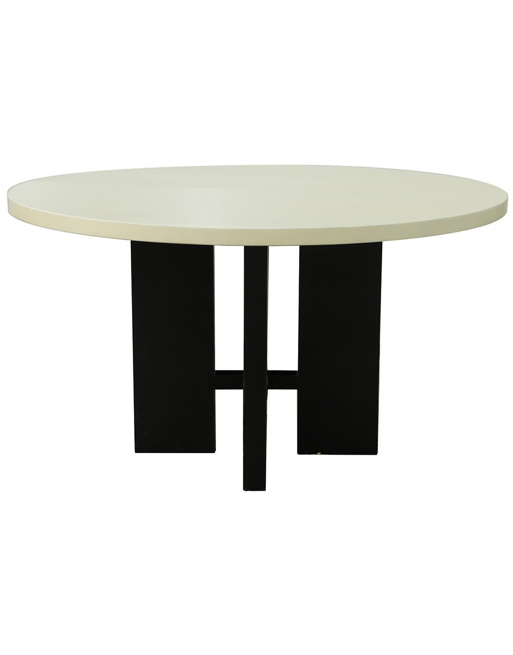 Round table made of oak wood with a central white lacquered base and a black lacquered leg.