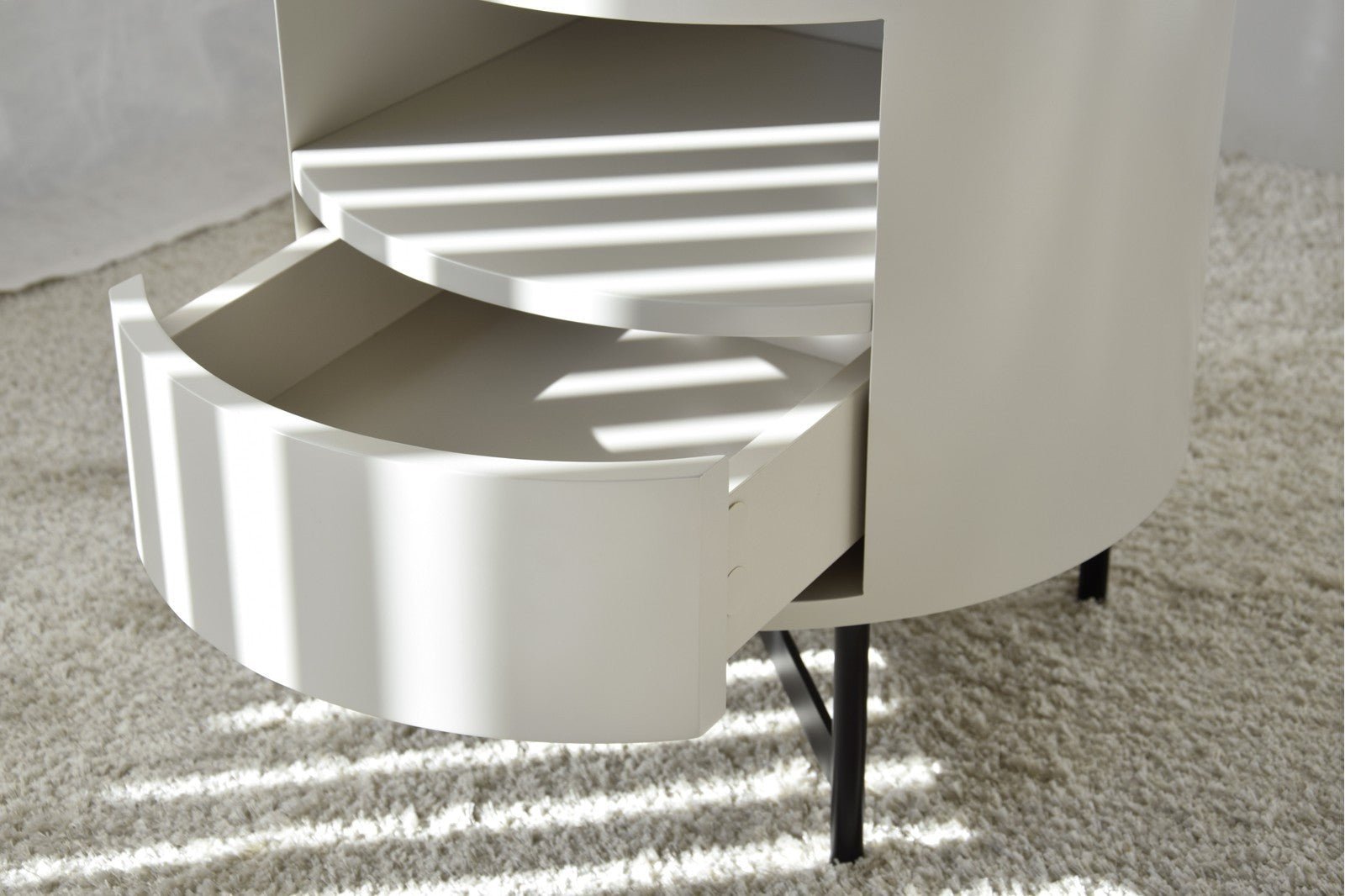 Round side table with a top made of sand grey lacquered MDF with a matte finish combined with brown and beige tones, the ceramic material used for the top, the leg made of matte black metal and it has a drawer.
