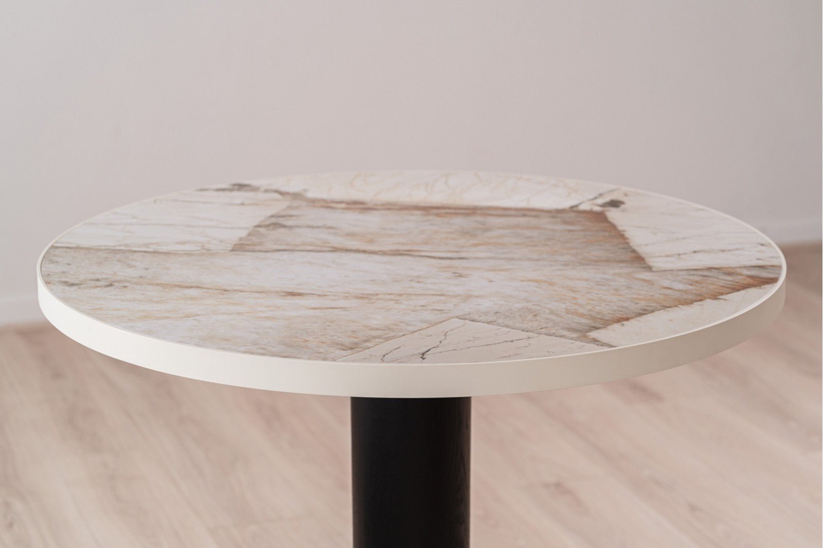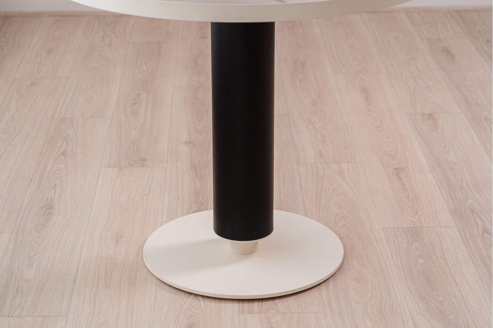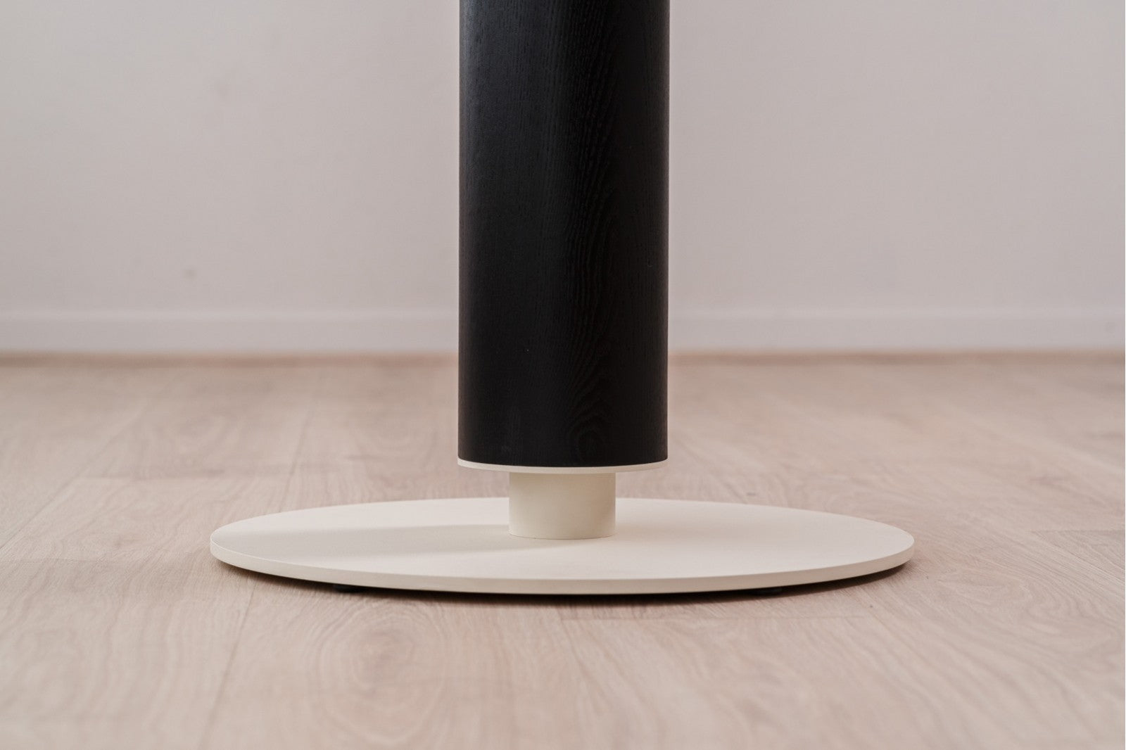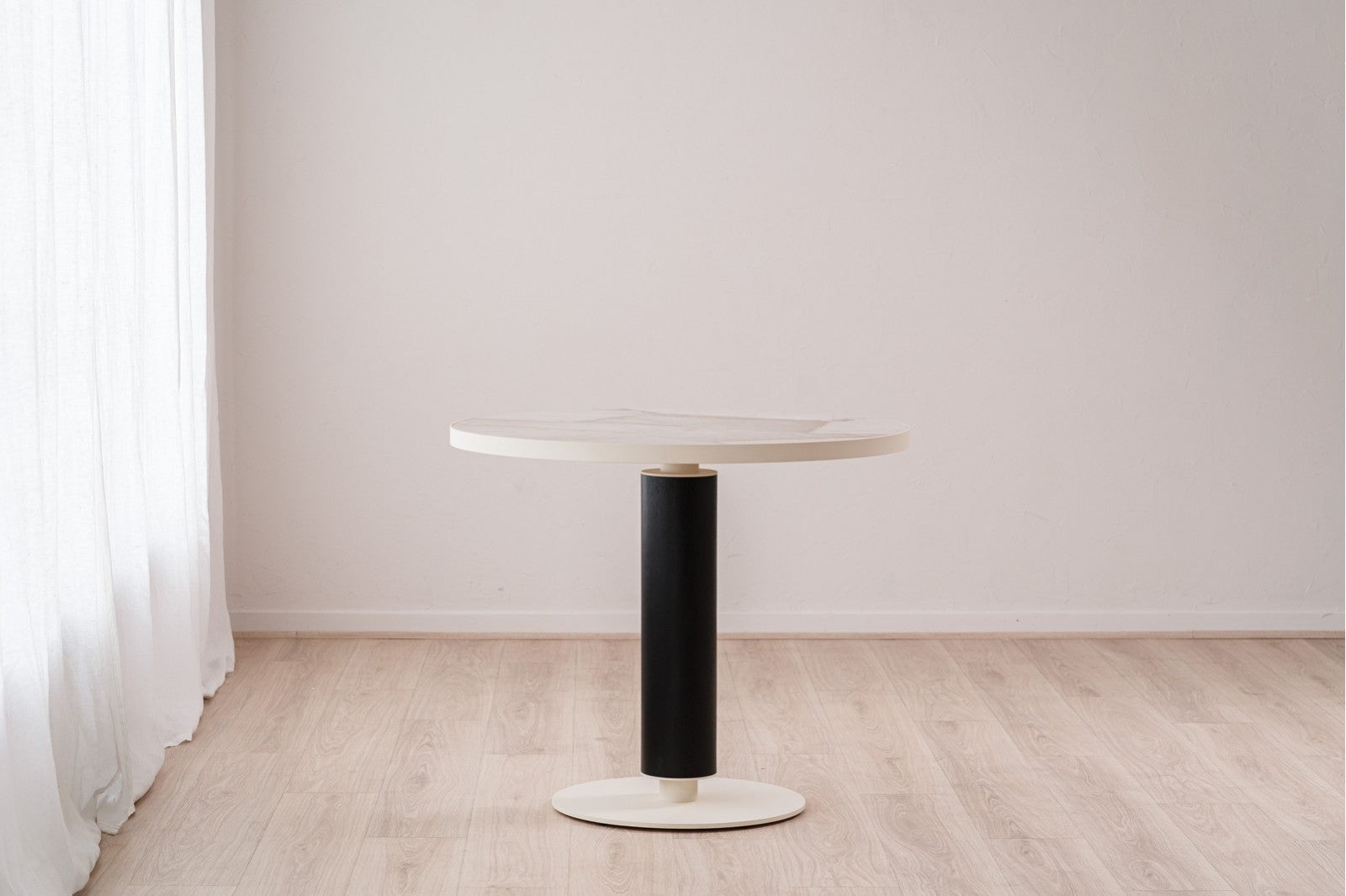 Round dining table made of light gray matte ceramic board with a slight rough texture and a base made of natural ash wood veneer.