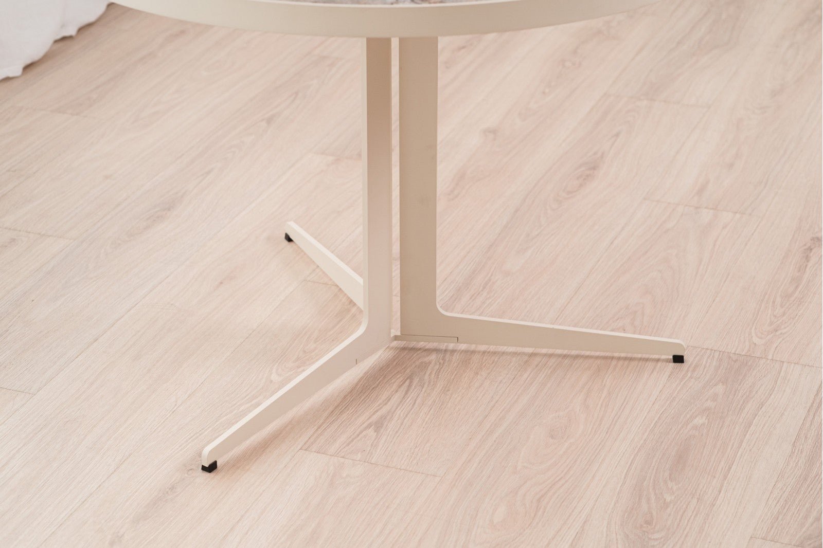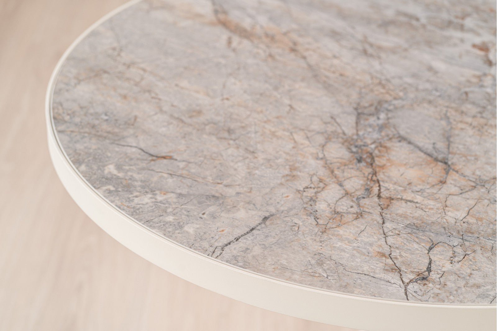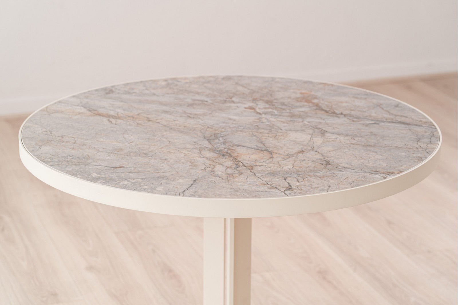 Round dining table made of light gray matte ceramic board with a slight rough texture and a base made of natural ash wood veneer.