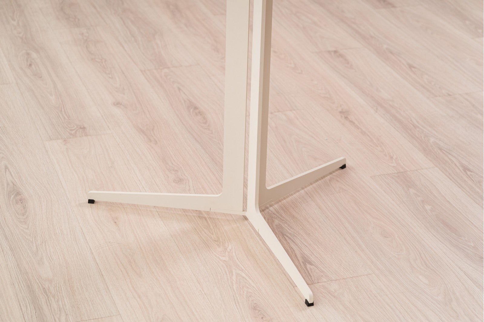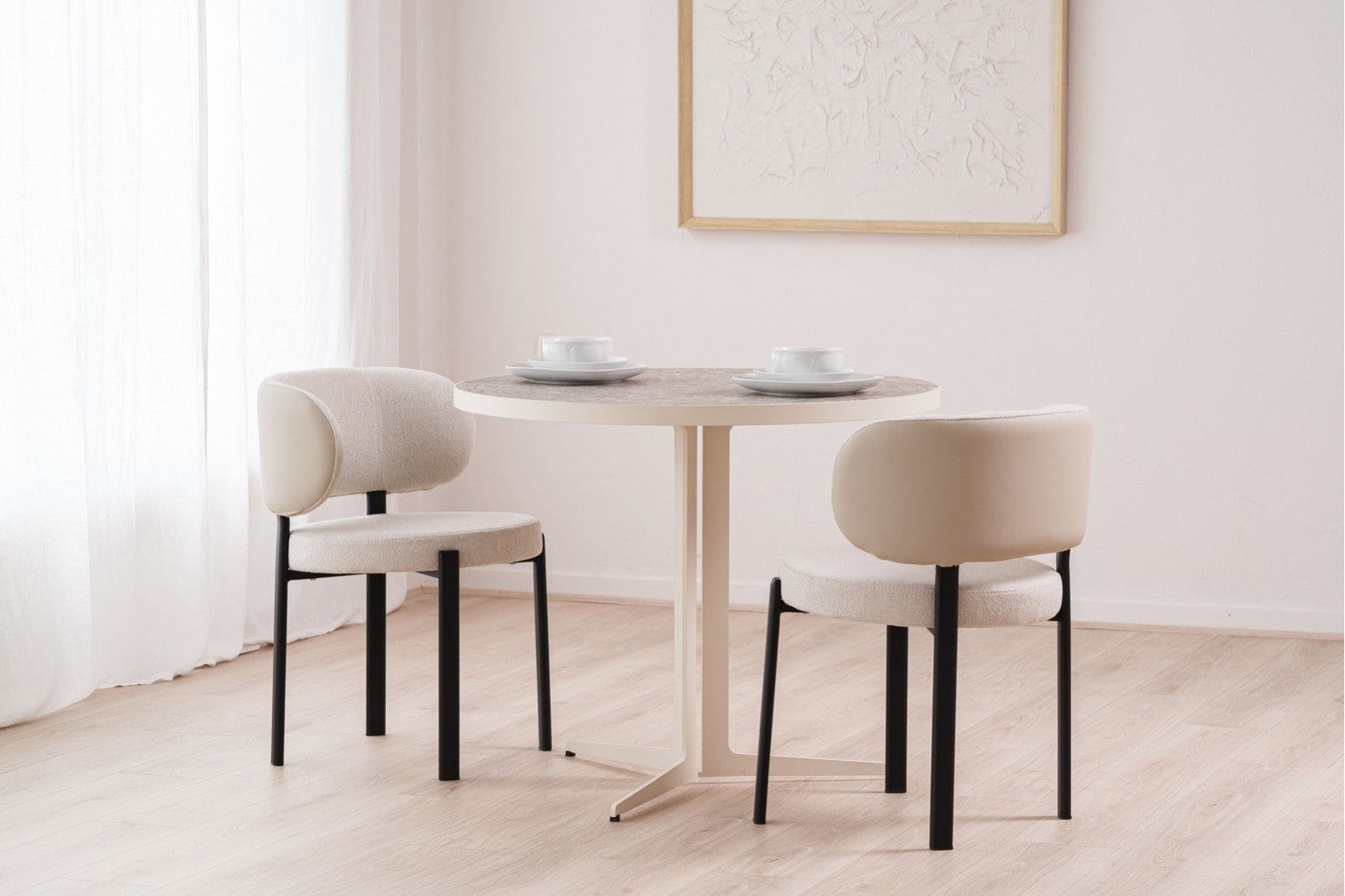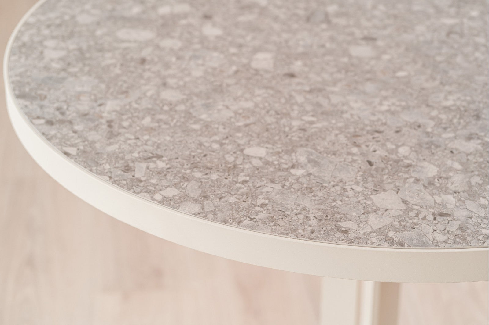 Round dining table made of light gray matte ceramic board with a slight rough texture and a base made of natural ash wood veneer.