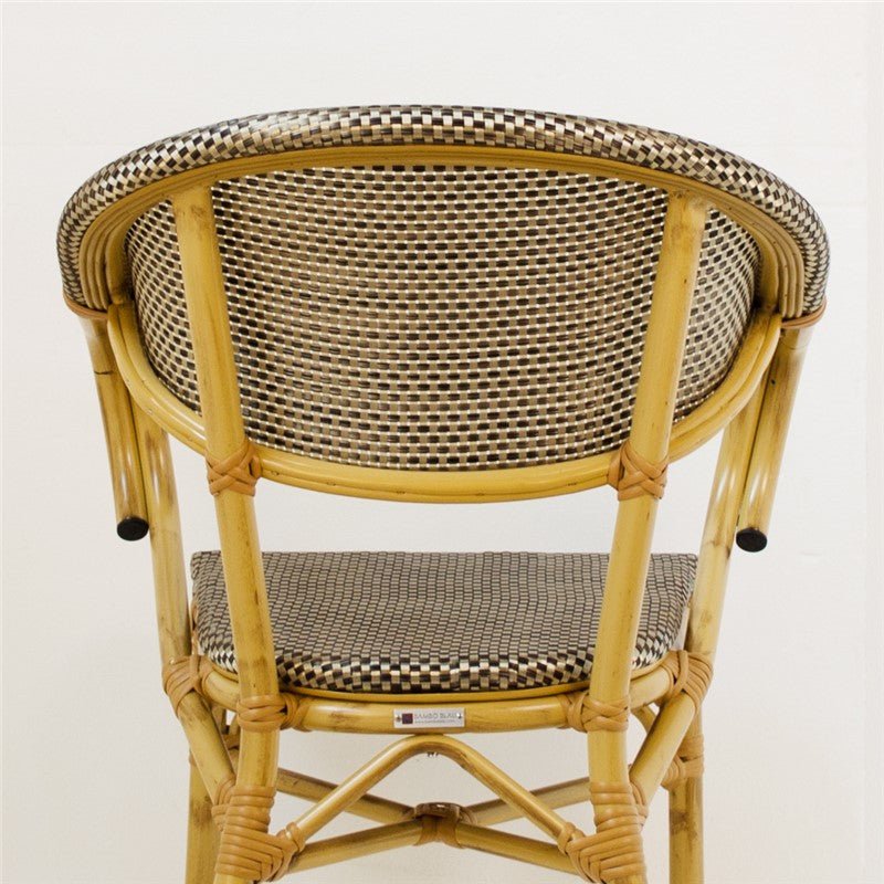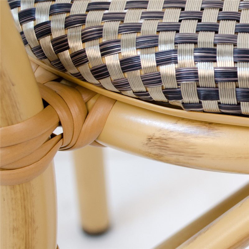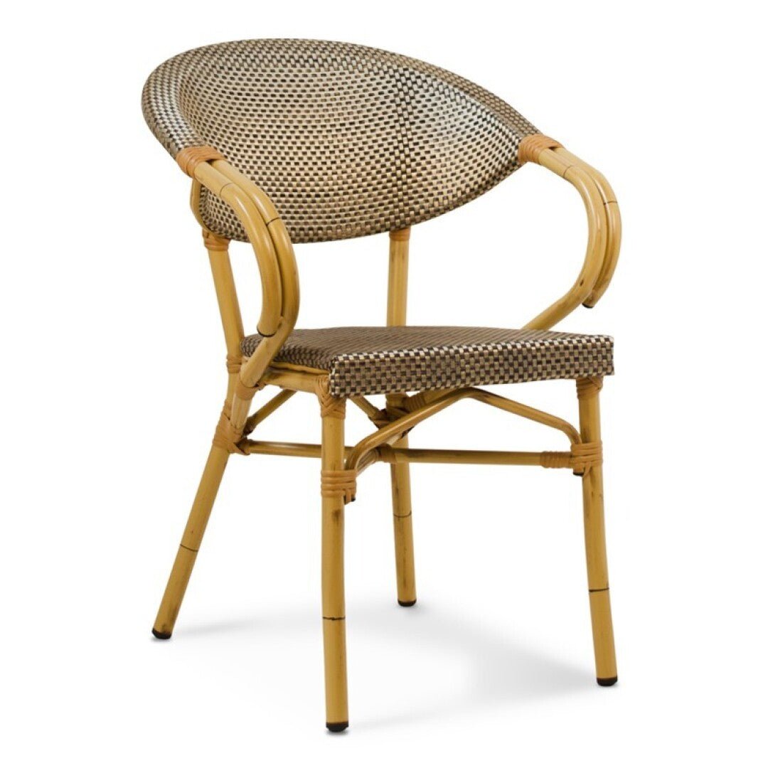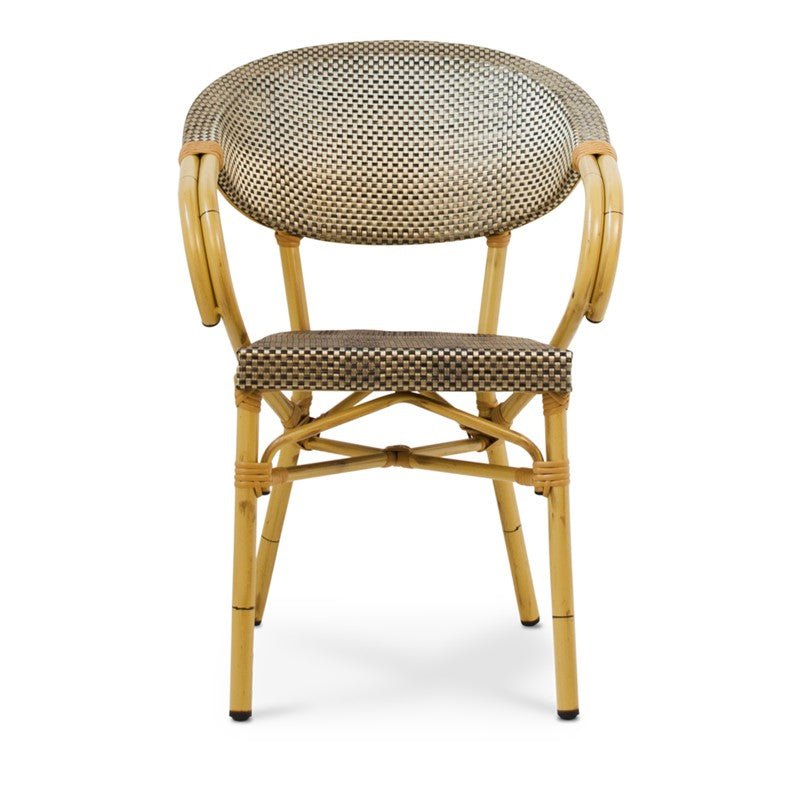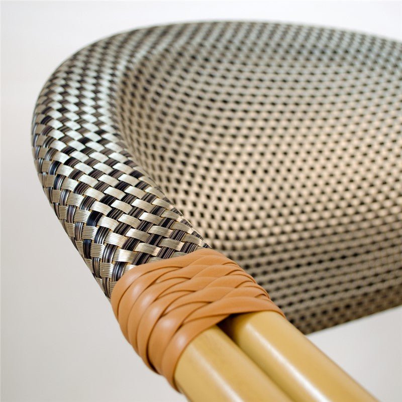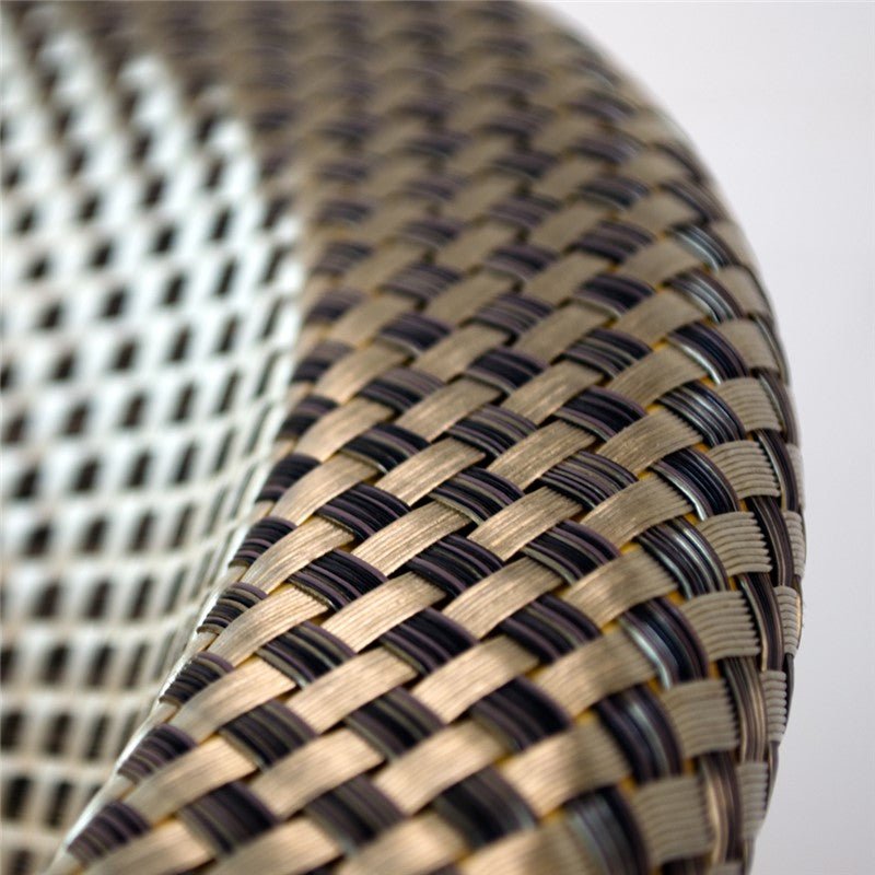 Chair with aluminium frame and rattan and textilene fabric finish in black and sand. Stackable.