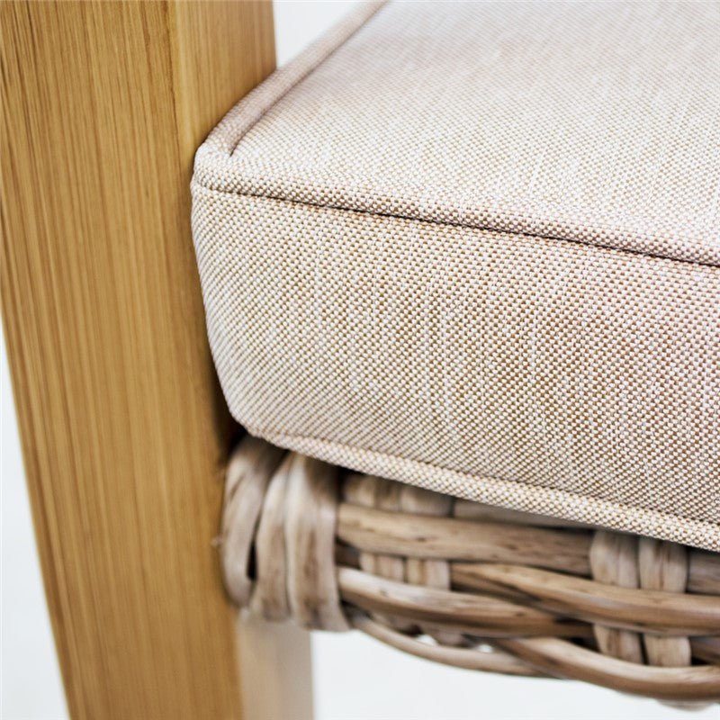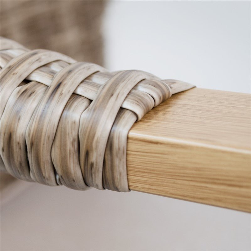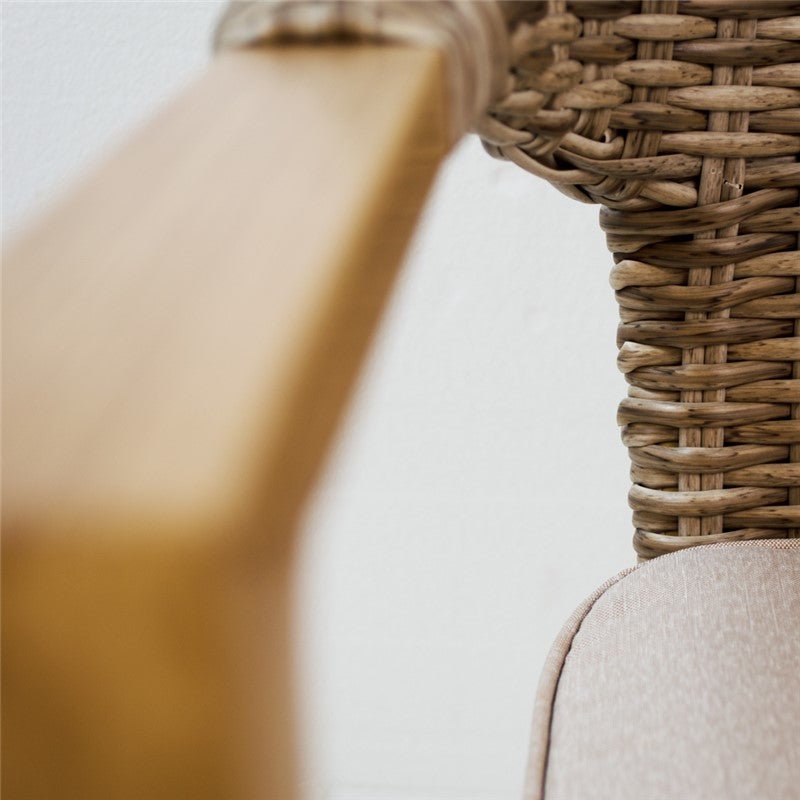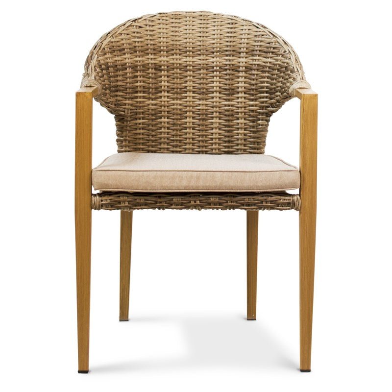 Armchair made of aluminum combined with natural and gray synthetic fabric, suitable for outdoor use, stackable, includes cushion and requires no assembly.