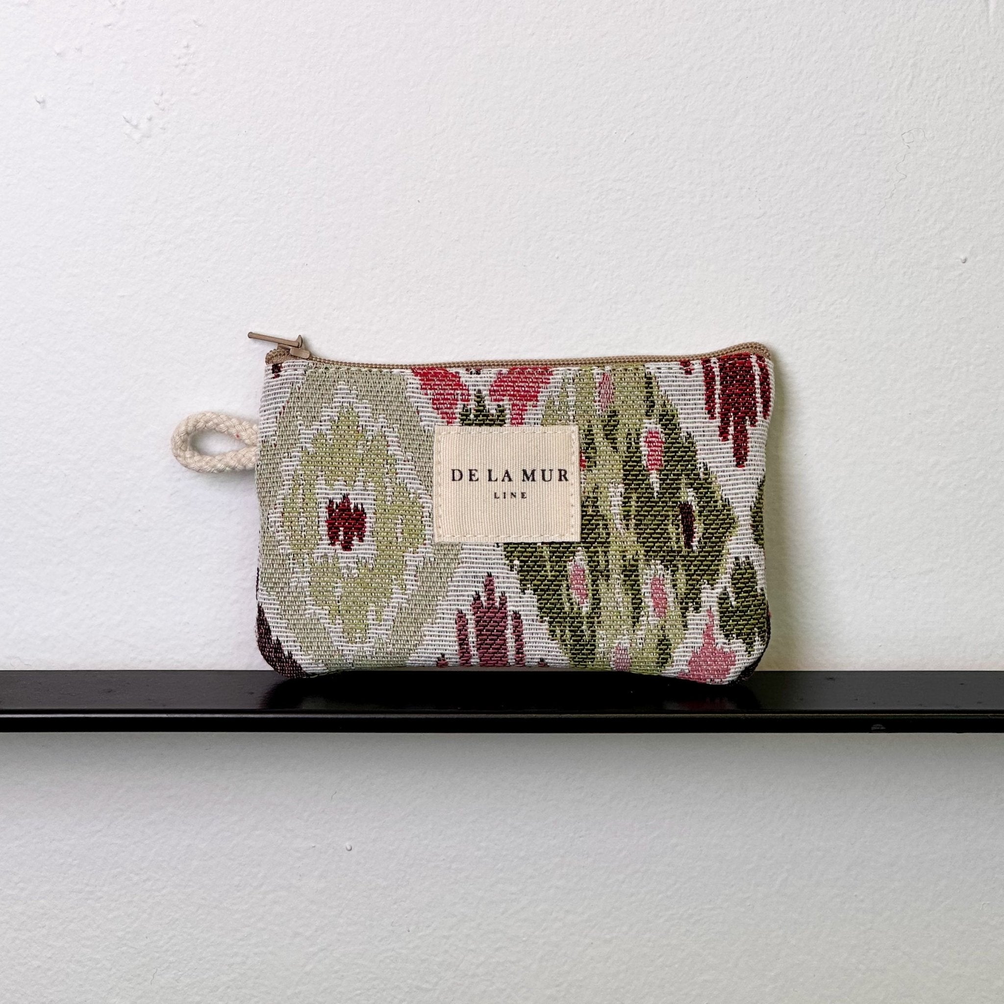 Purse with a zip on the top and a small ecru cord handle on the side. Made of multicoloured geometric print fabric. Each item may have a variation in the print, depending on where the piece was cut. Lined with thick grey fabric on the inside. For proper maintenance, we recommend washing it cold by hand and not using a dryer.