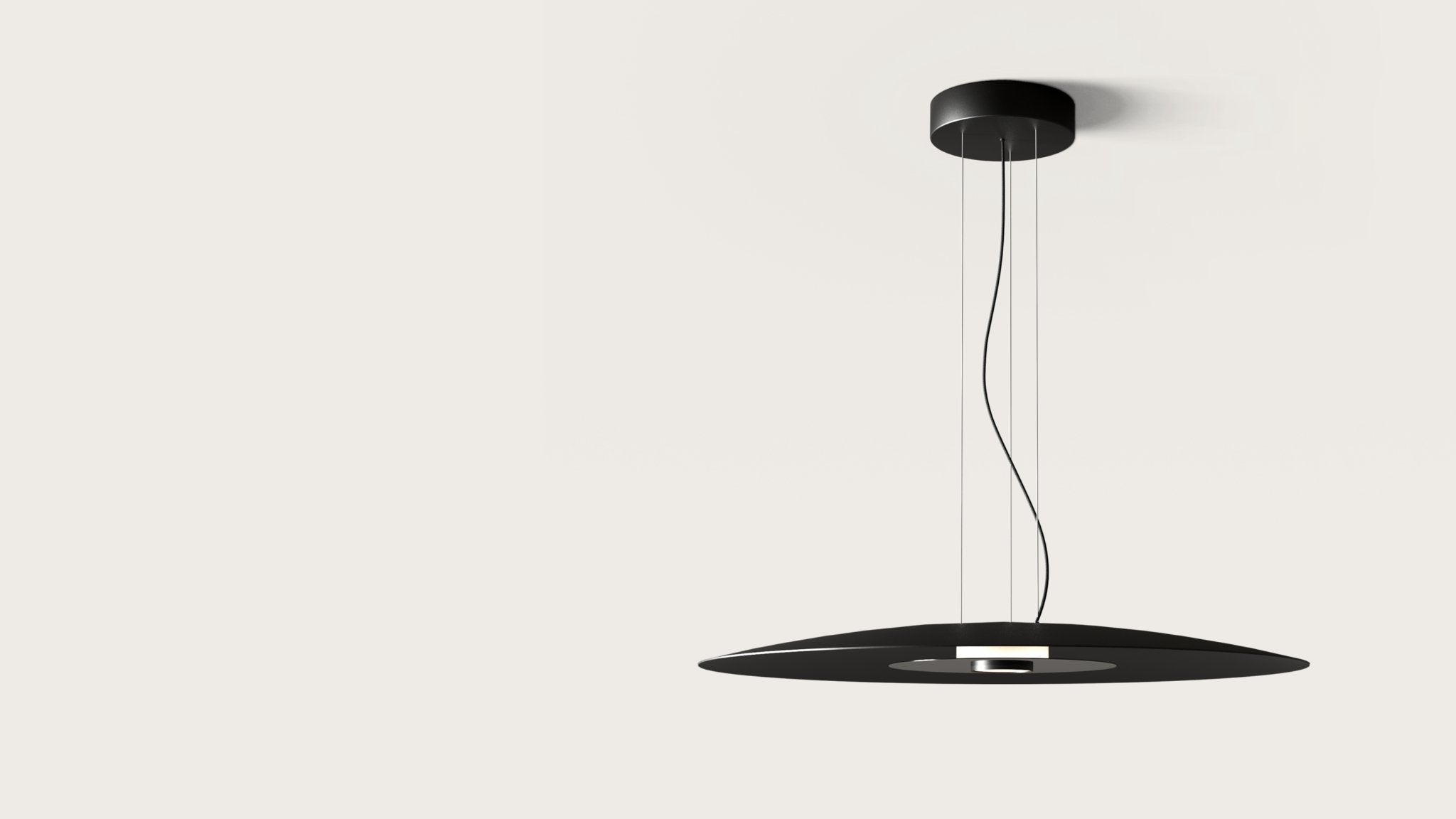 Designer ceiling lamp made of steel with the outer dome in matte black and the internal flat mirror diffuser with small details in matte gold.