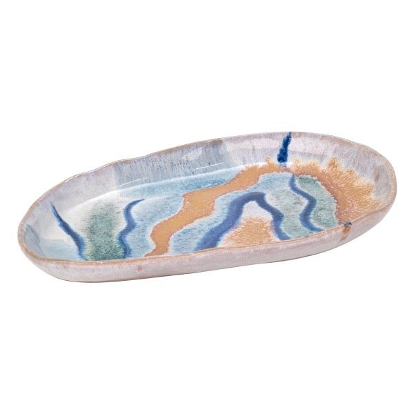 Beautiful oval appetizer plate made of multicoloured stoneware with marine motifs.