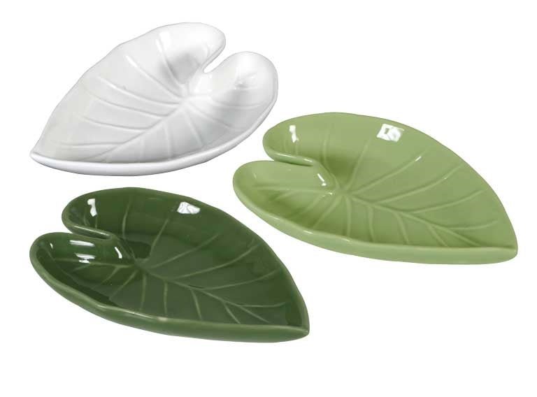Beautiful leaf-shaped appetizer plate made of ceramic in light green, dark green and white.