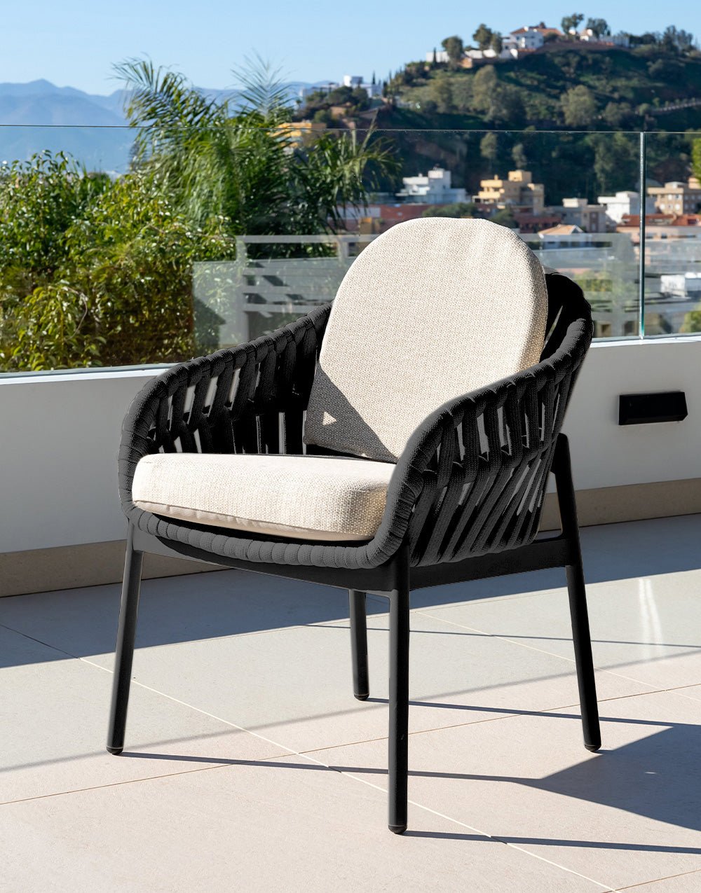 Outdoor armchair made of anthracite and beige aluminum. Beige cushions. Back and sides hand-woven with anthracite rope.