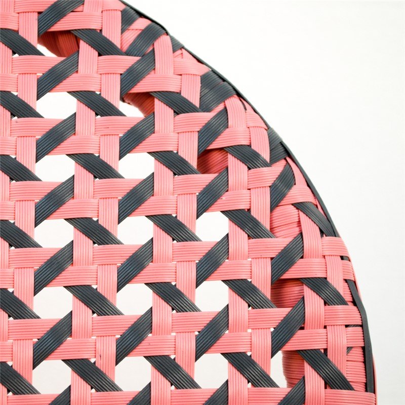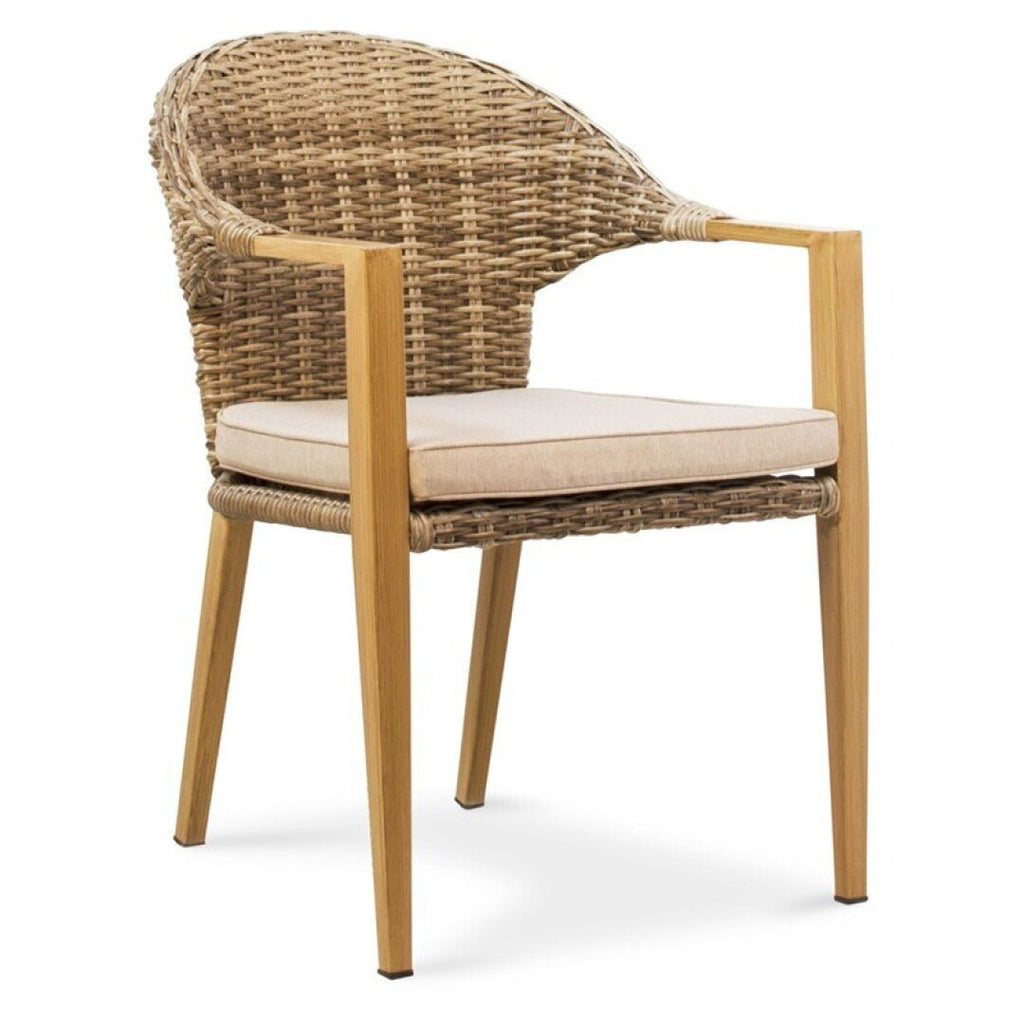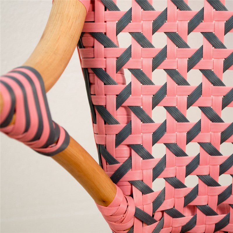 Armchair made of natural cane and pink and gray synthetic fabric. Recommended for indoor and covered outdoor use, stackable.
