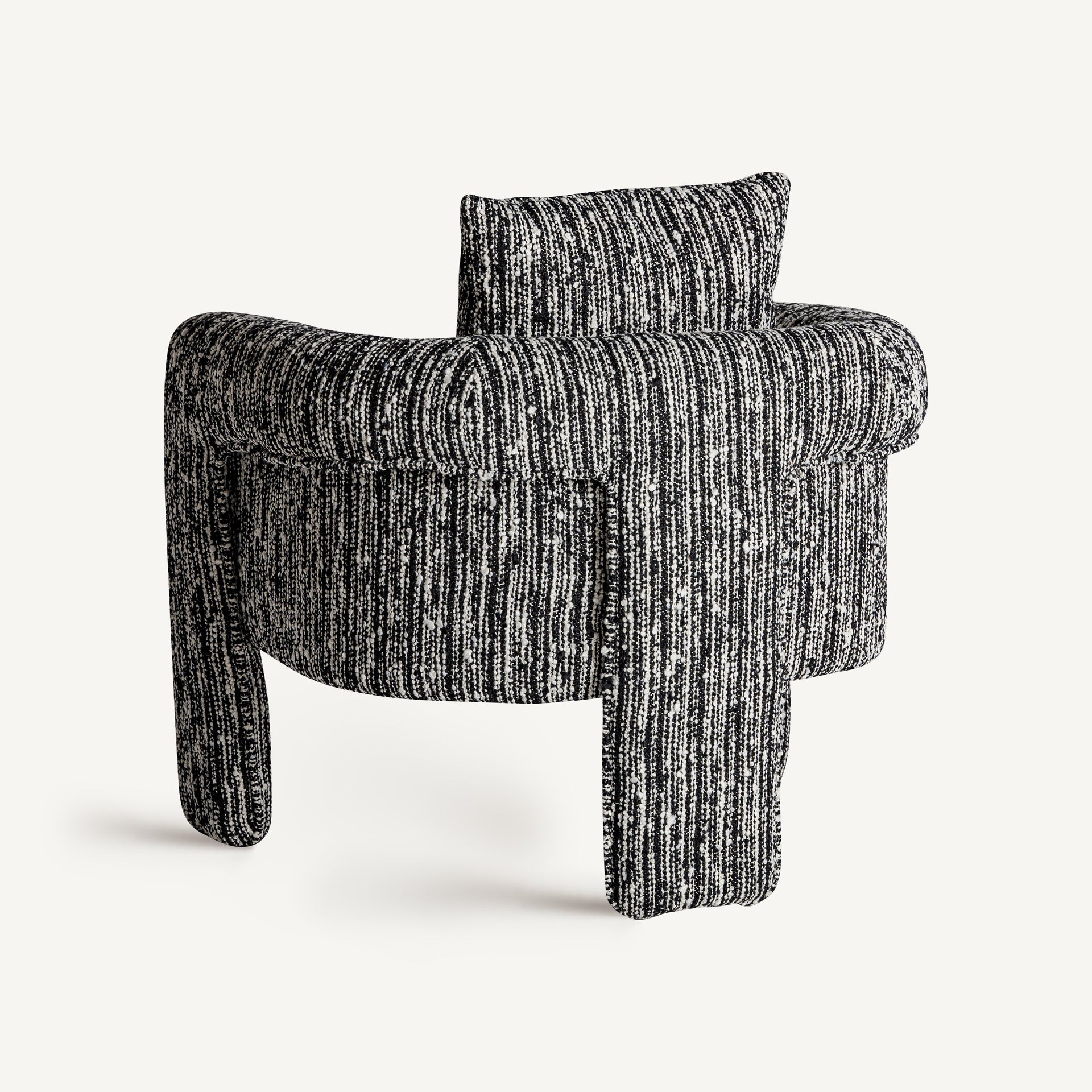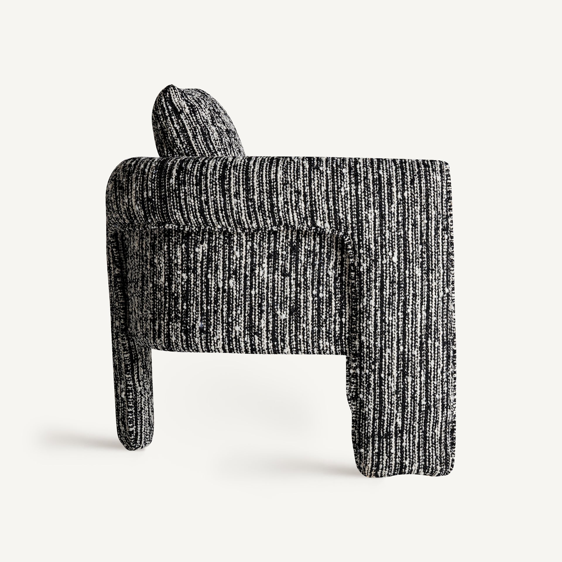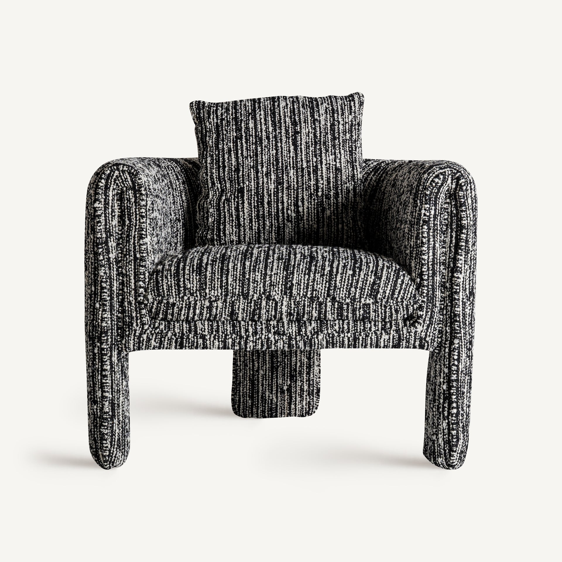 Contemporary style armchair, made of black polyester with a mottled finish, combined with pine and plywood.
