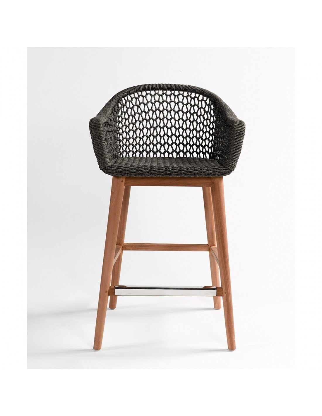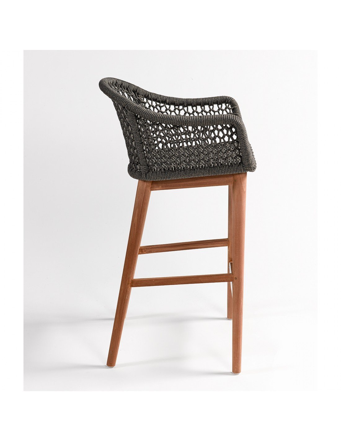 Teak wood stool with grey rope seat and backrest. Ideal for decorating your garden or terrace.