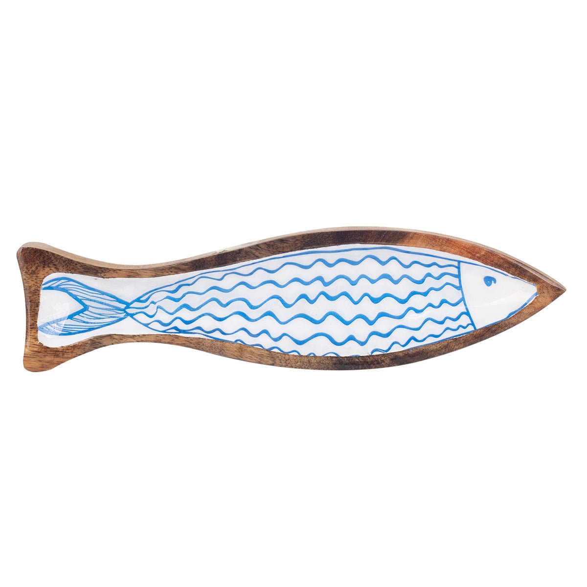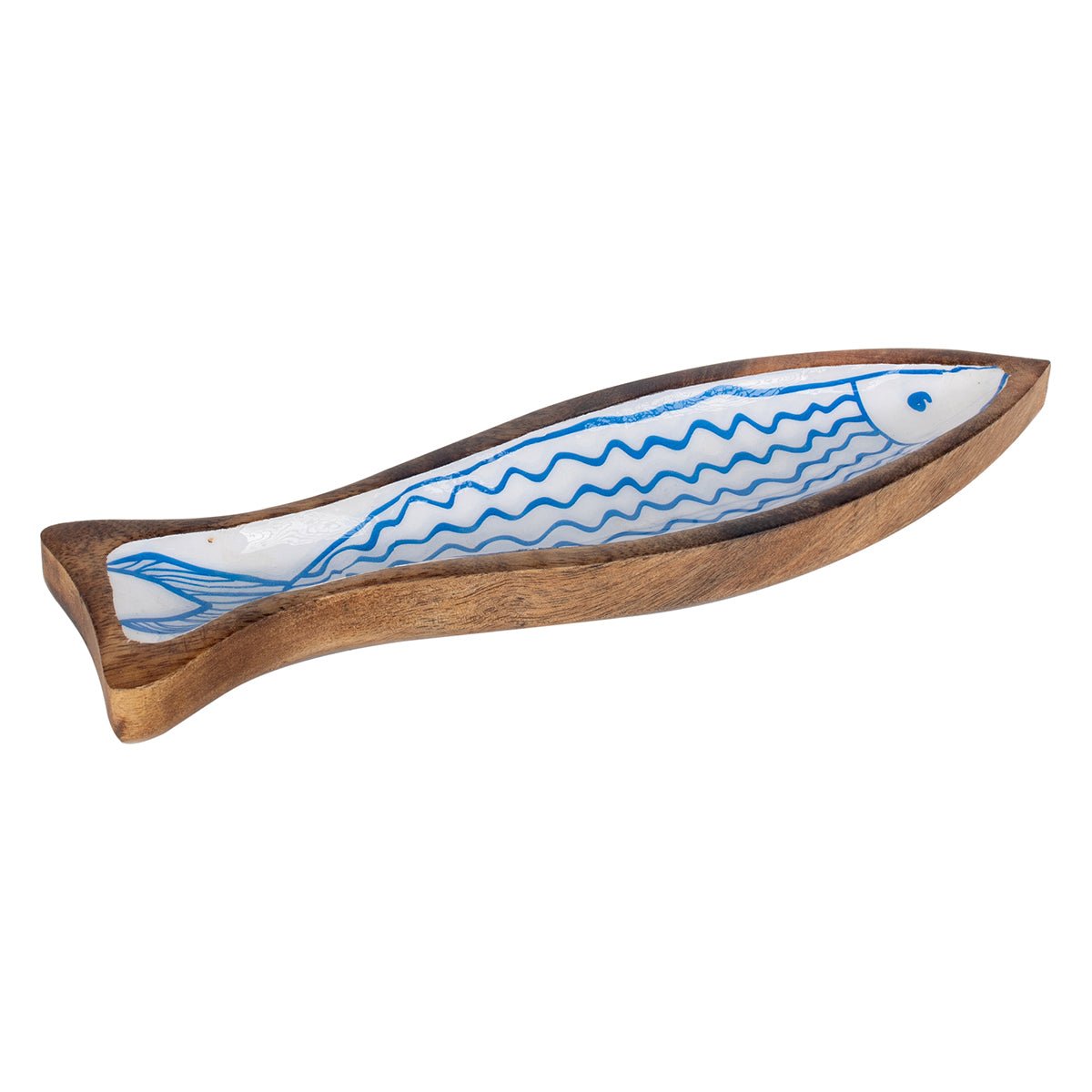 Fish-shaped appetizer platter made of natural wood and enamelled in white and light blue.