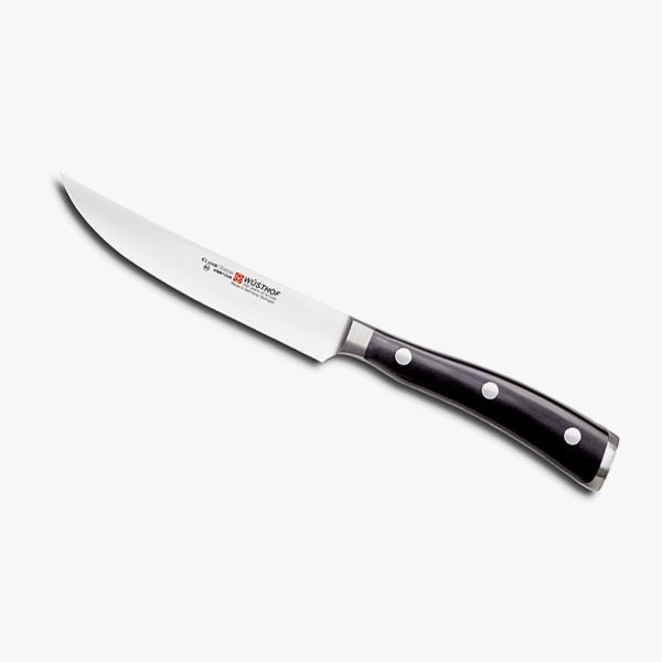 The Wüsthof Classic Ikon White 12cm Steak Knife It is, as its name might already suggest, perfect for cutting a good piece of meat. This knife is enhanced with a cream colored handle. The cutting edge is not enhanced with serrations, but is simply sharp. Exactly what a high-quality steak knife should be.