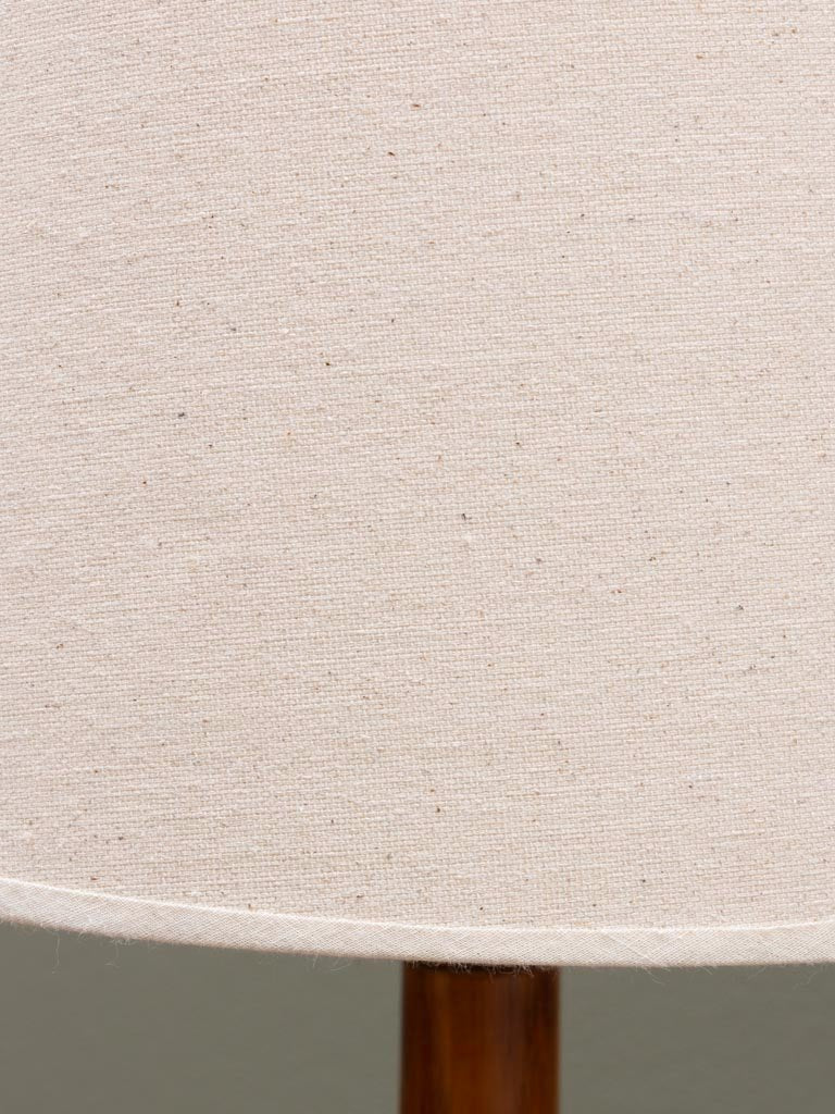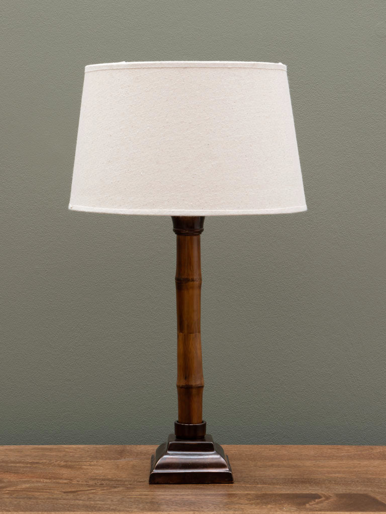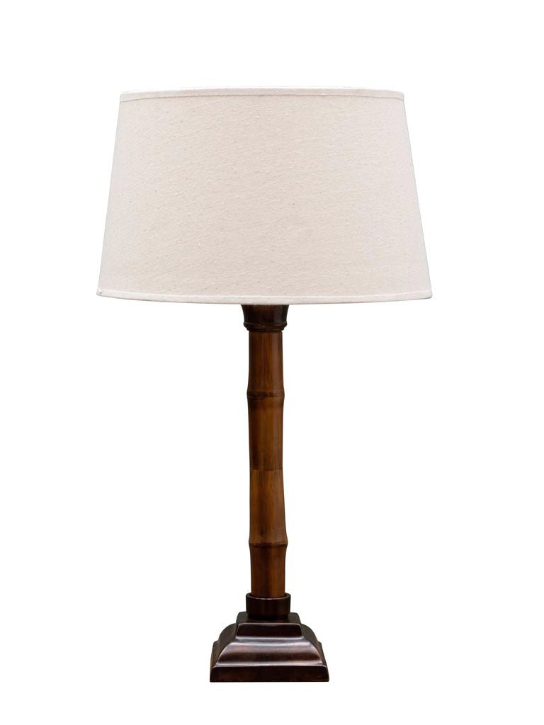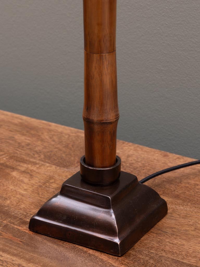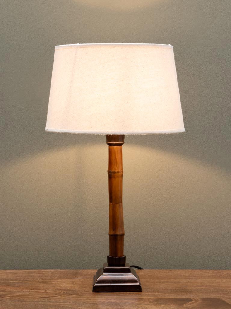 Beautiful table lamp made of bamboo and brown aluminum with a natural beige linen shade included.