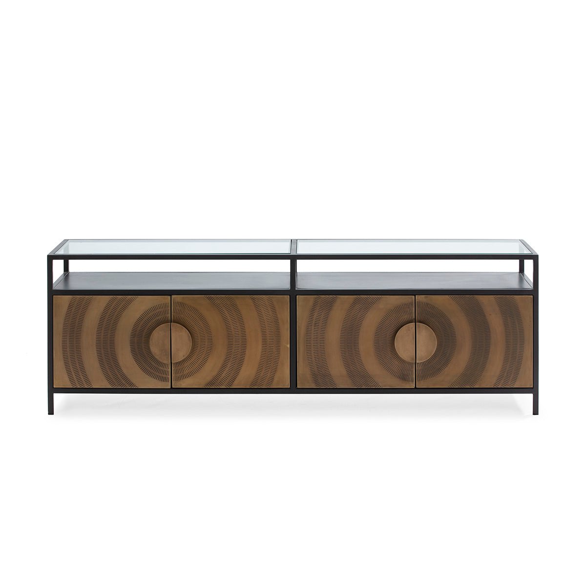 Aparador con un diseño muy original en cristal y metal, en color negro y dorado.