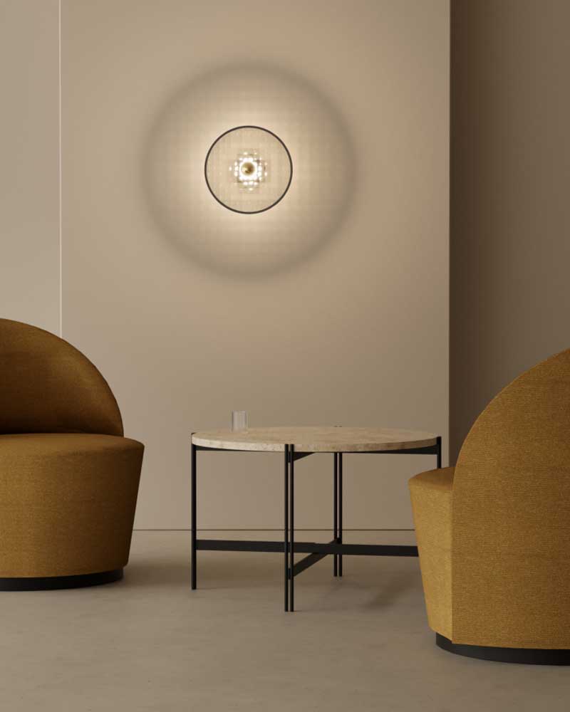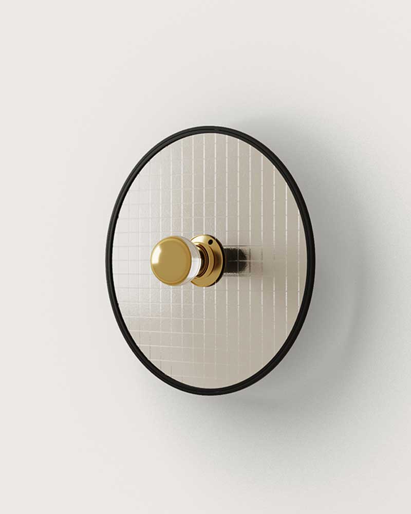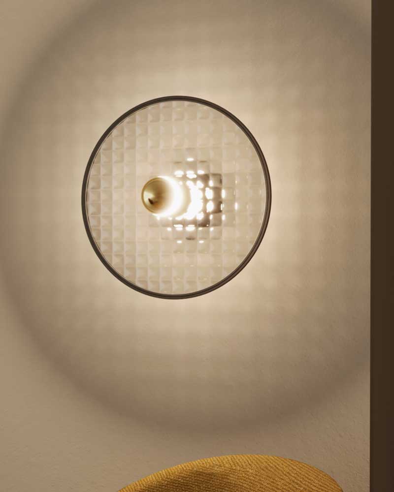 Precioso aplique de pared de diseño circular fabricado en acero y cristal texturizado diseñado por Fornasevi. El acabado del metal puede ser de diferentes colores: oro brillo, cromo, blanco y negro.