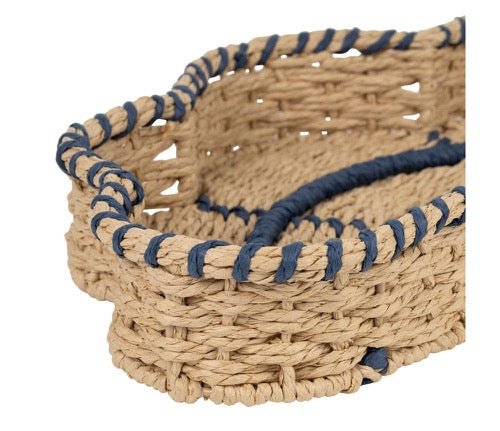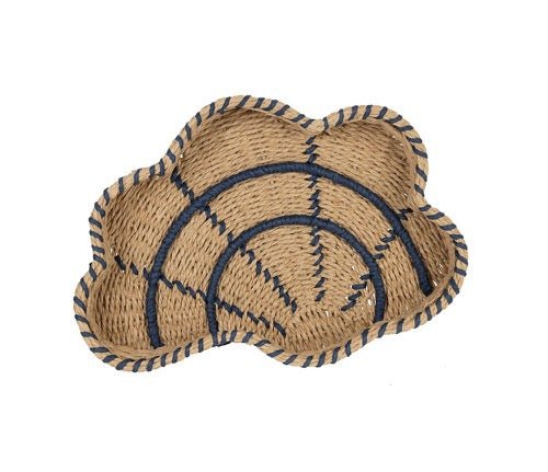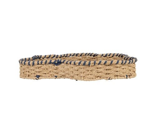 Preciosa bandeja en forma de pez fabricada en hierro y cuerda de papel con colores natural y azul.
