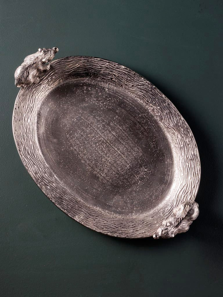 Preciosa bandeja con dos osos en los extremos fabricada en aluminio color plateado.