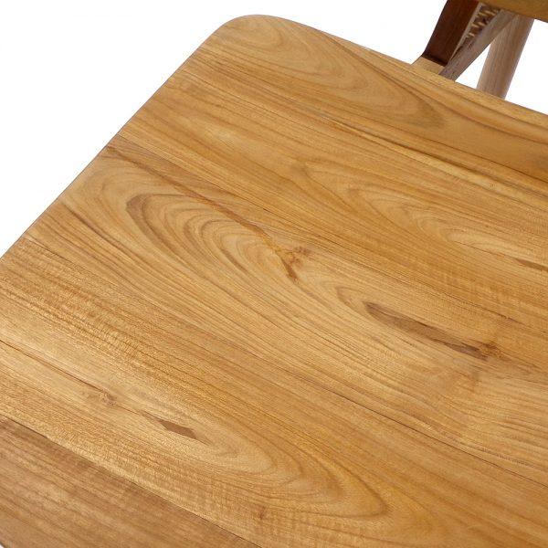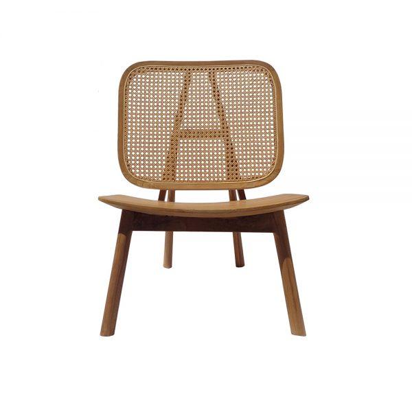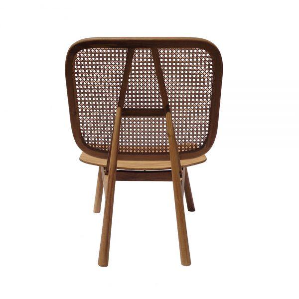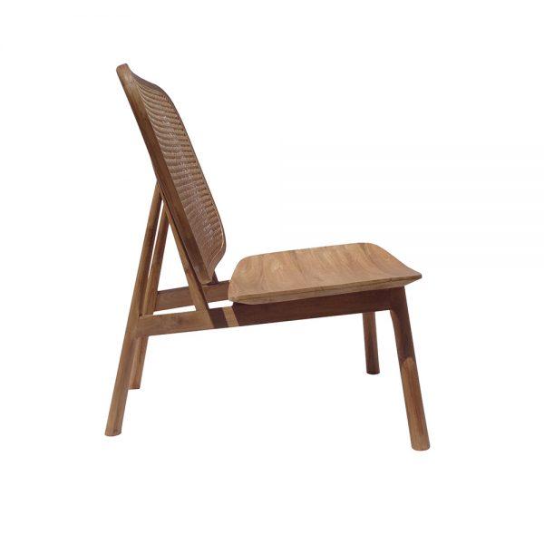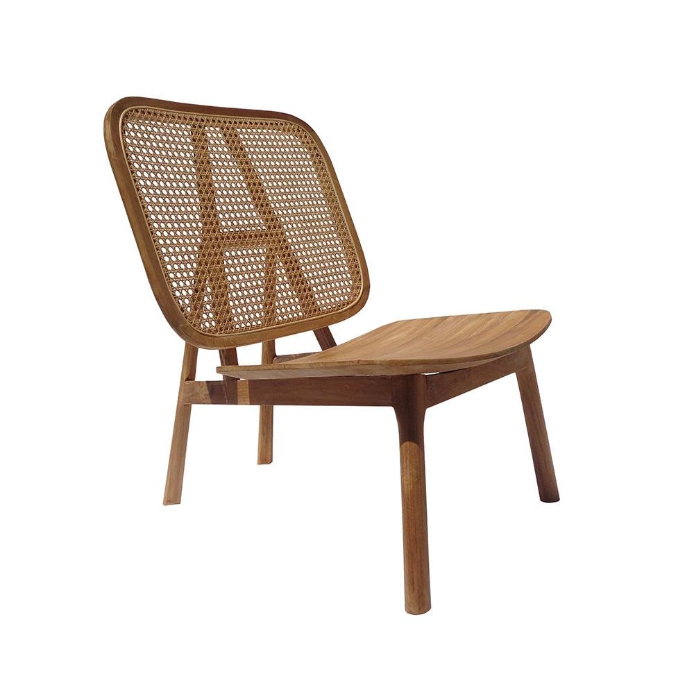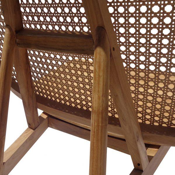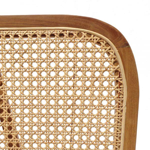 Butaca de madera de teca color natural con respaldo de rejilla en ratán.