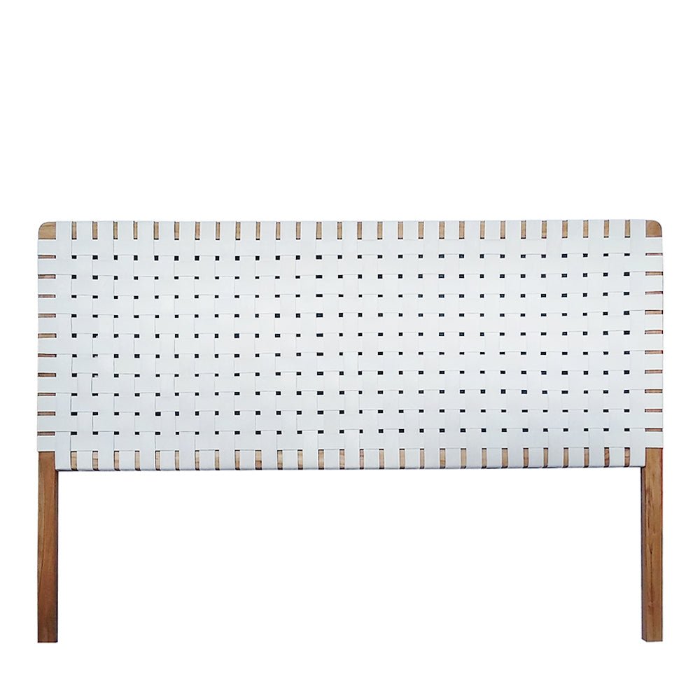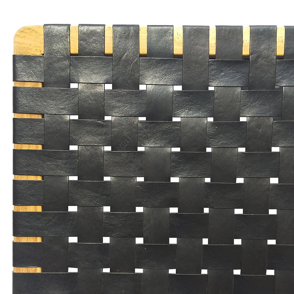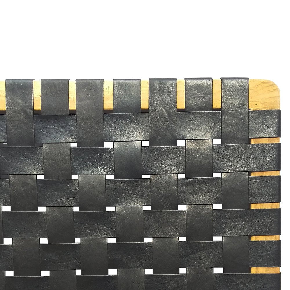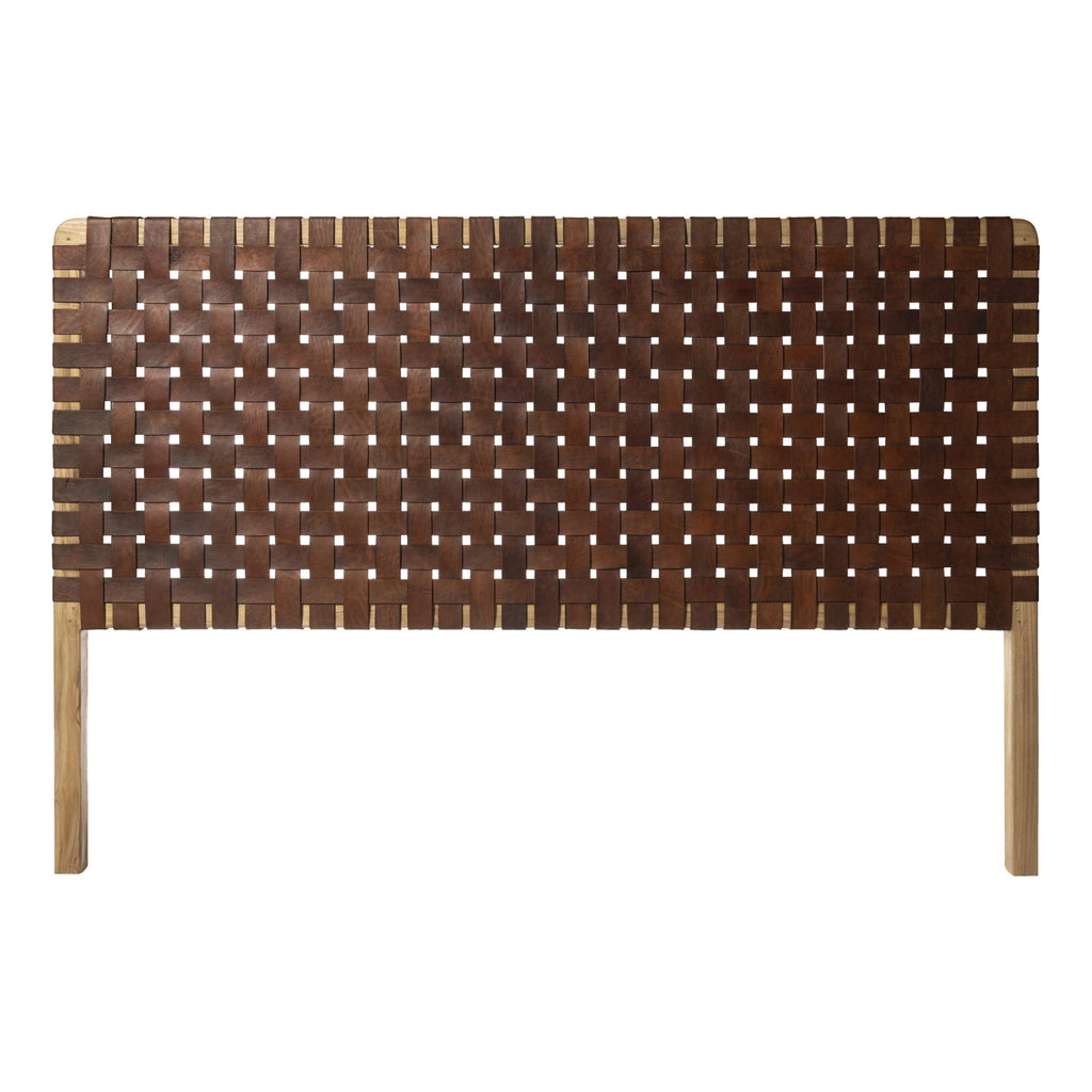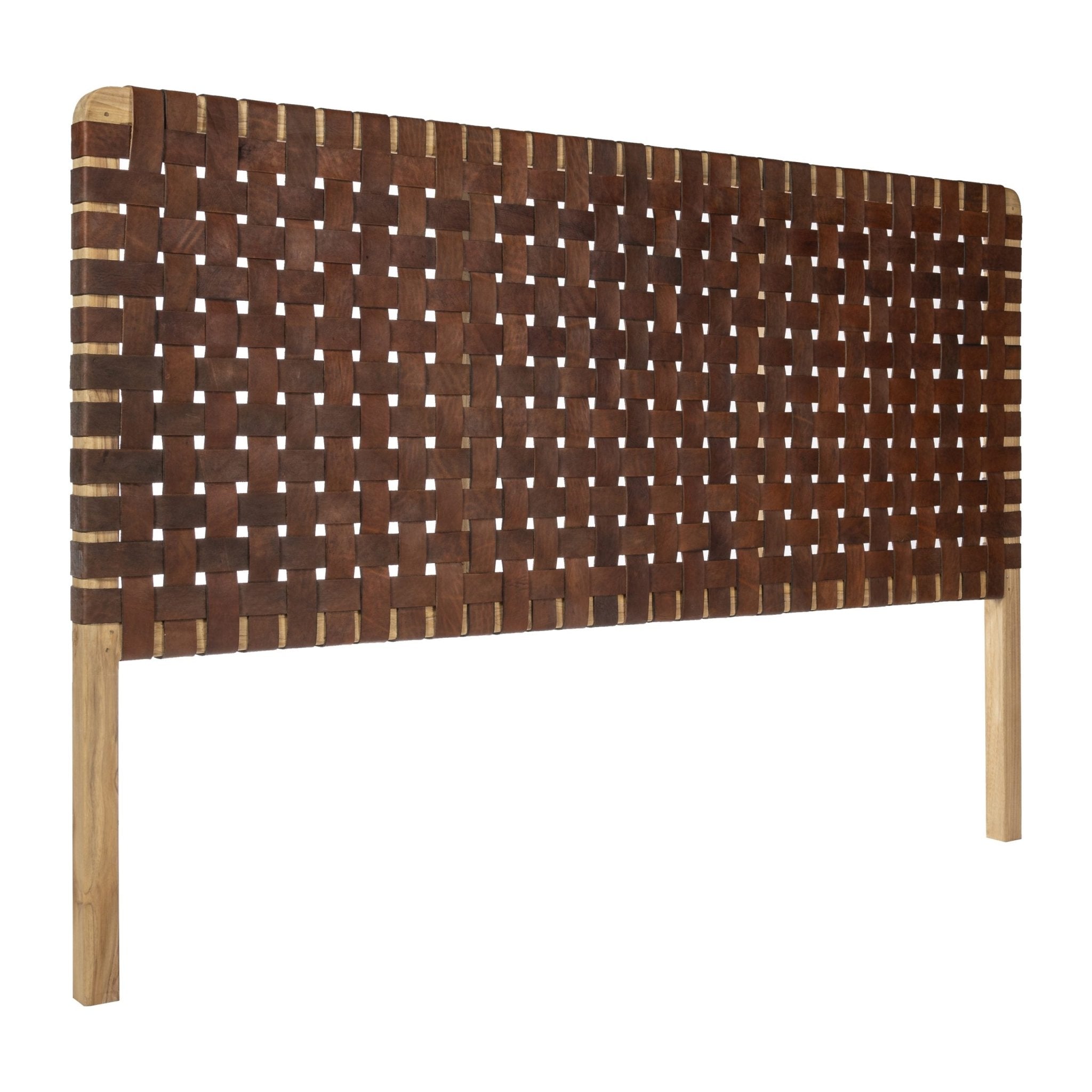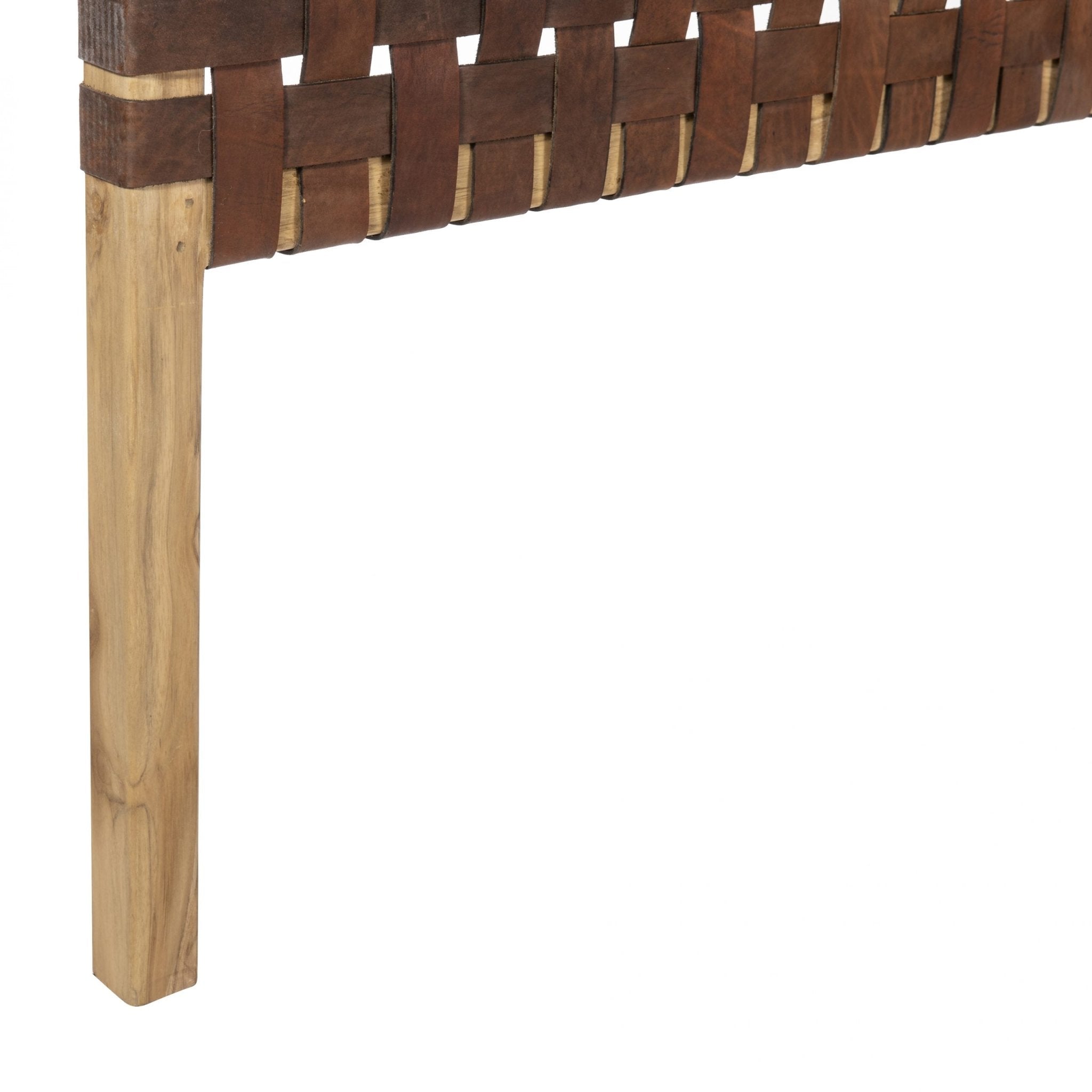 Cabecero con estructura de madera de teca con tapizado entramado de cuero, disponible en tres colores blanco, marrón y negro.