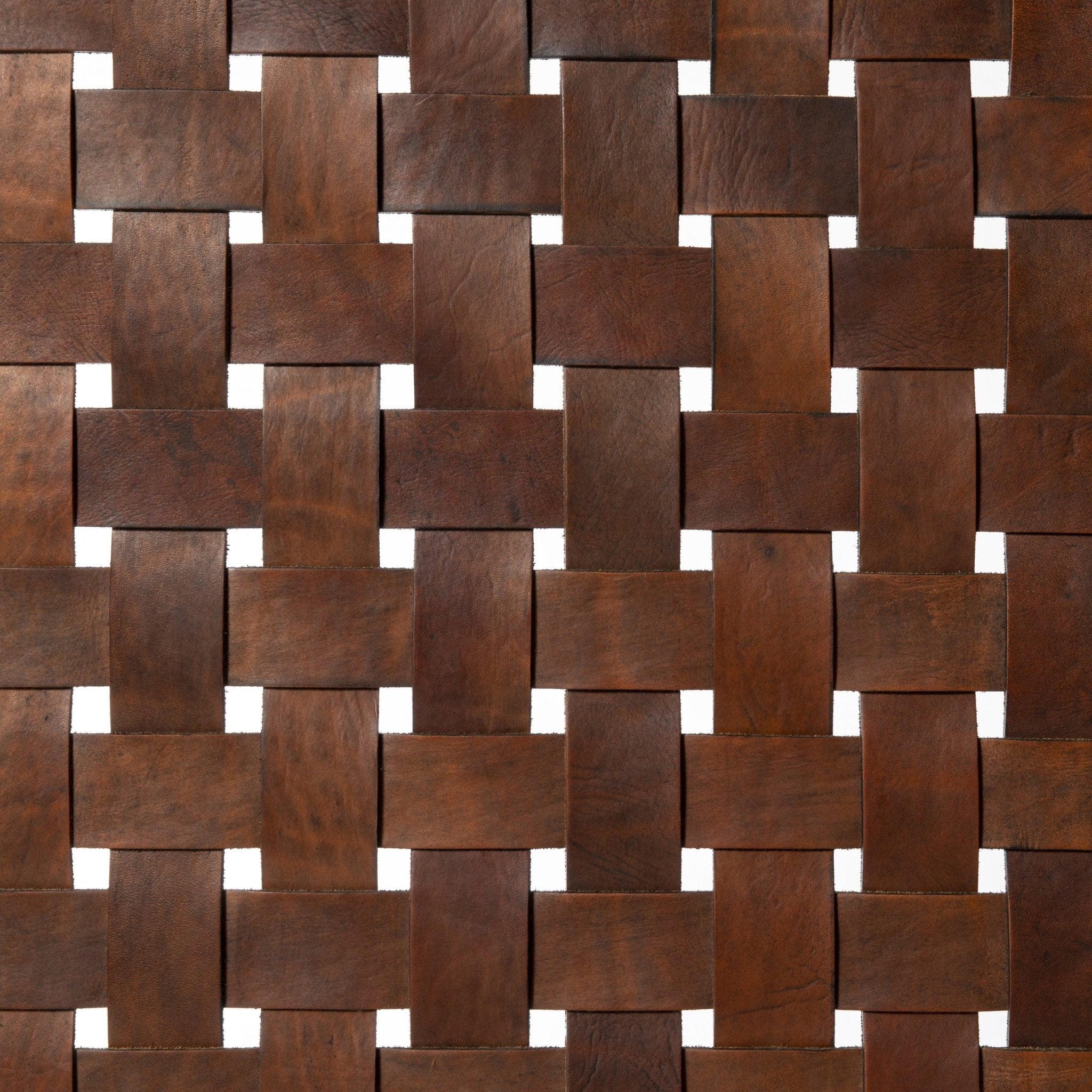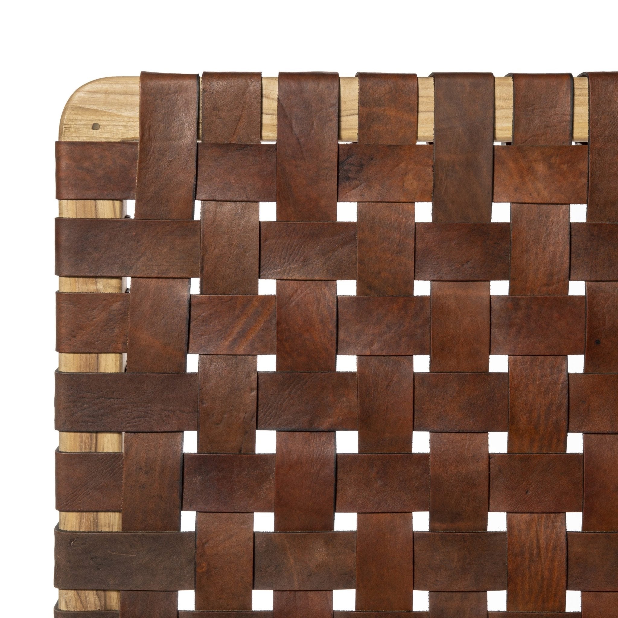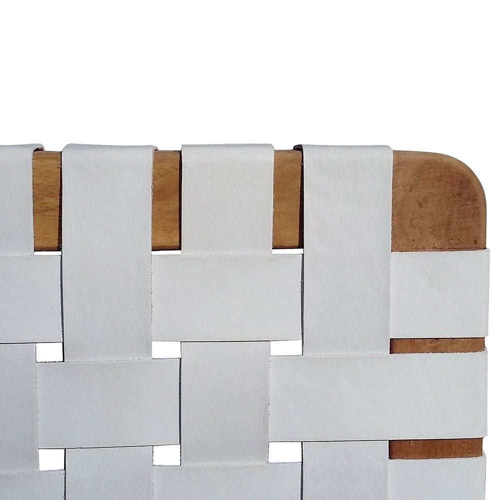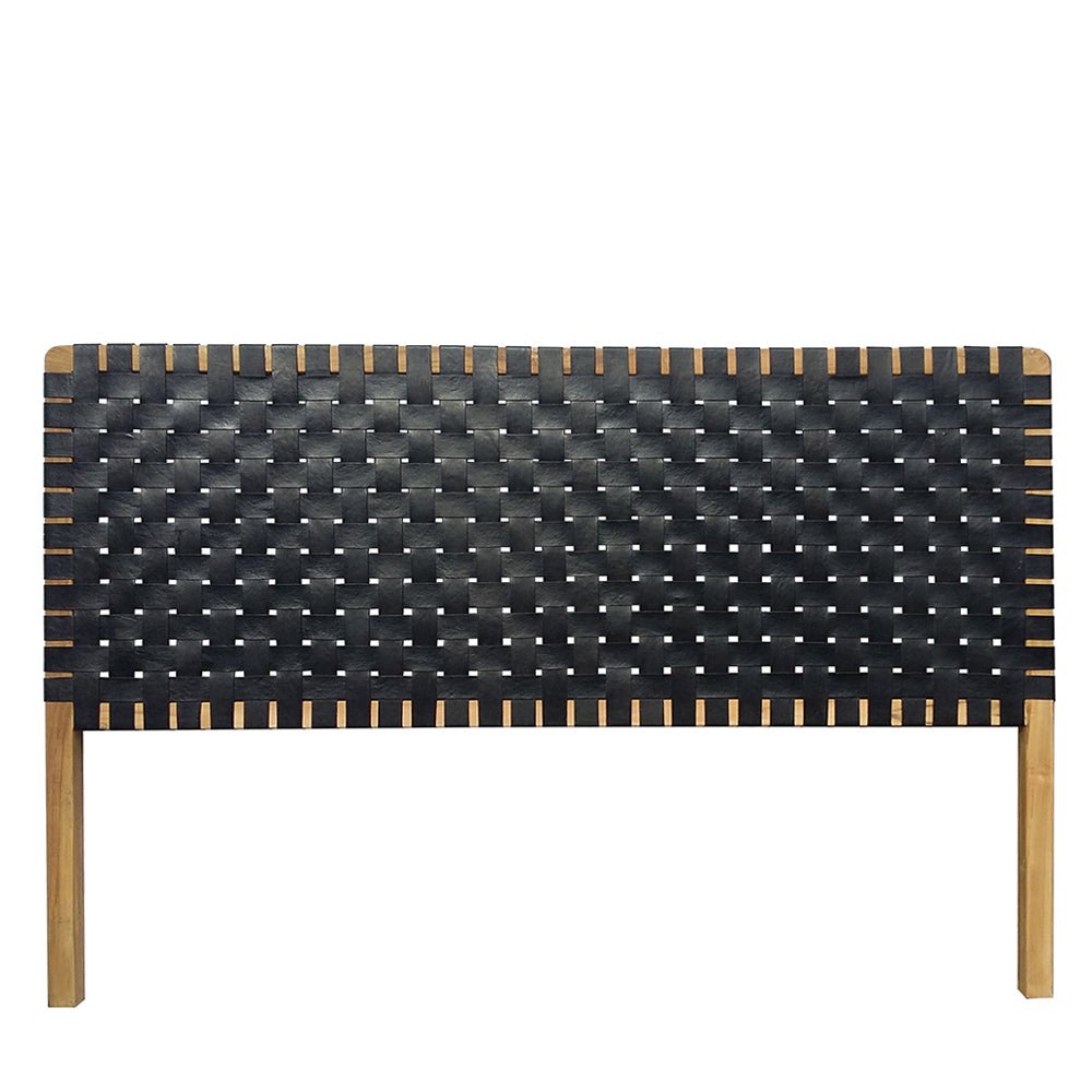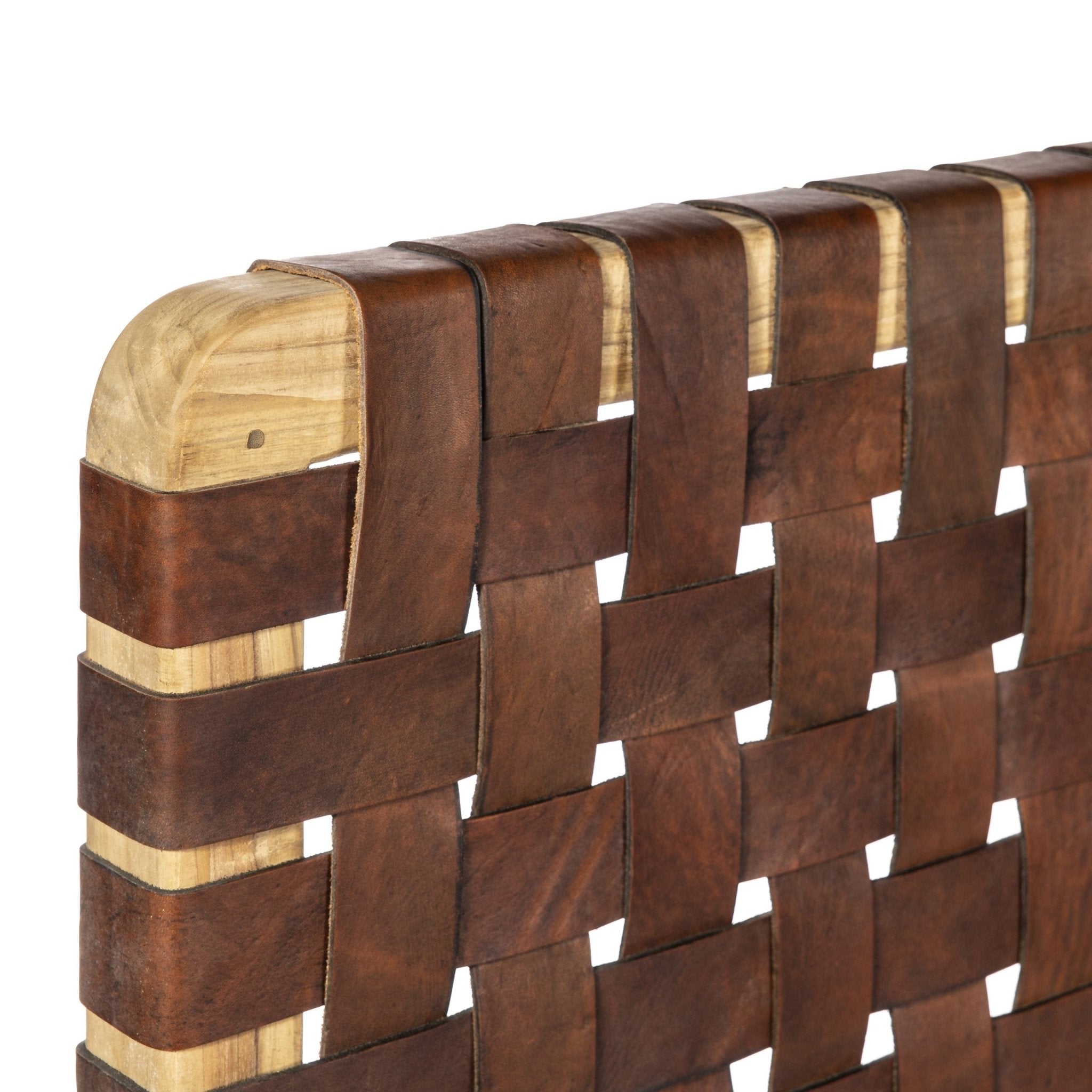 Cabecero con estructura de madera de teca con tapizado entramado de cuero, disponible en tres colores blanco, marrón y negro.