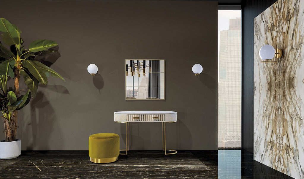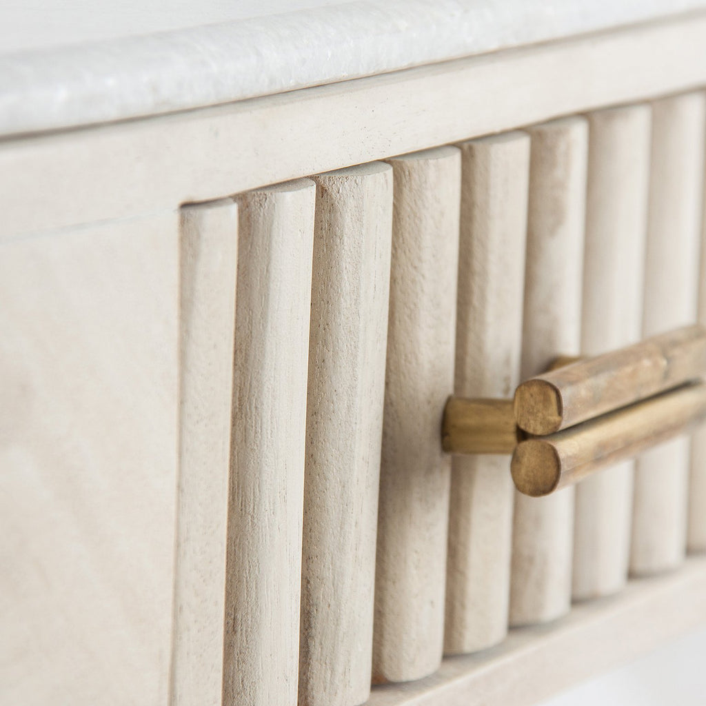 Consola fabricada en madera de mango, hierro y latón en color crema y oro de estilo art decó.