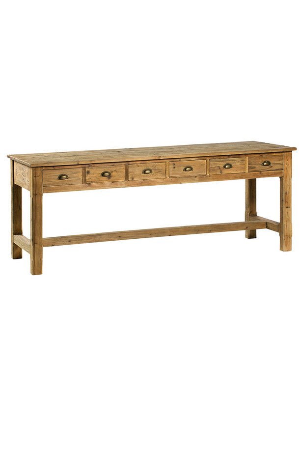 Preciosa consola fabricada en madera de pino color natural, consta de 6 cajones dos de ellos son de decoración.
