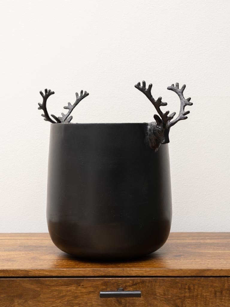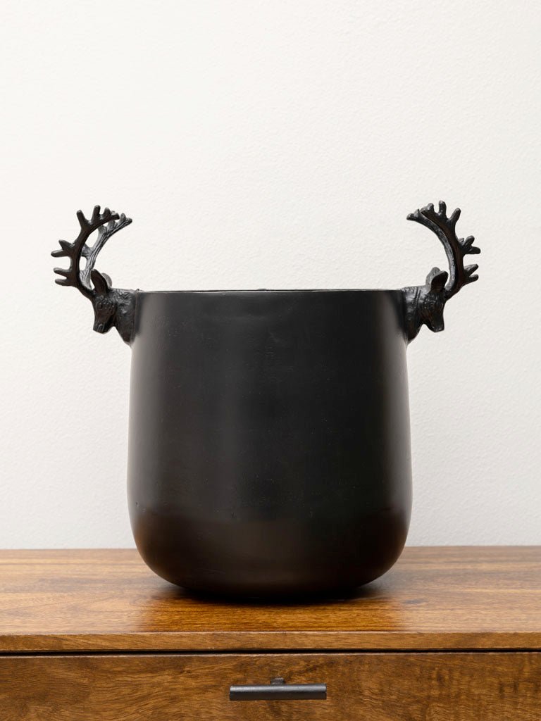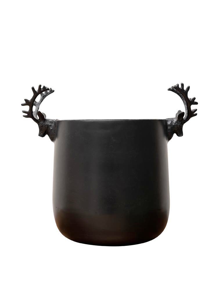 Preciosa cubitera con dos ciervos haciendo función de asas en aluminio de color negro.