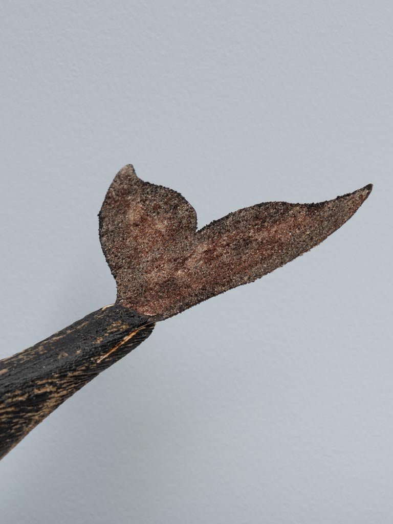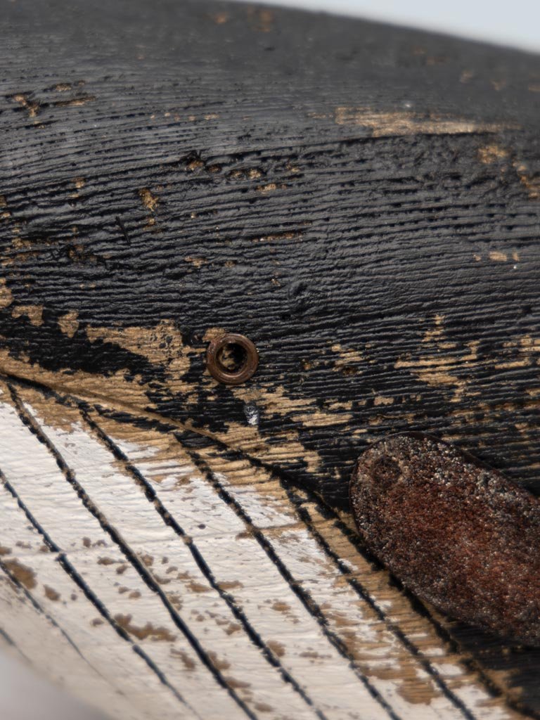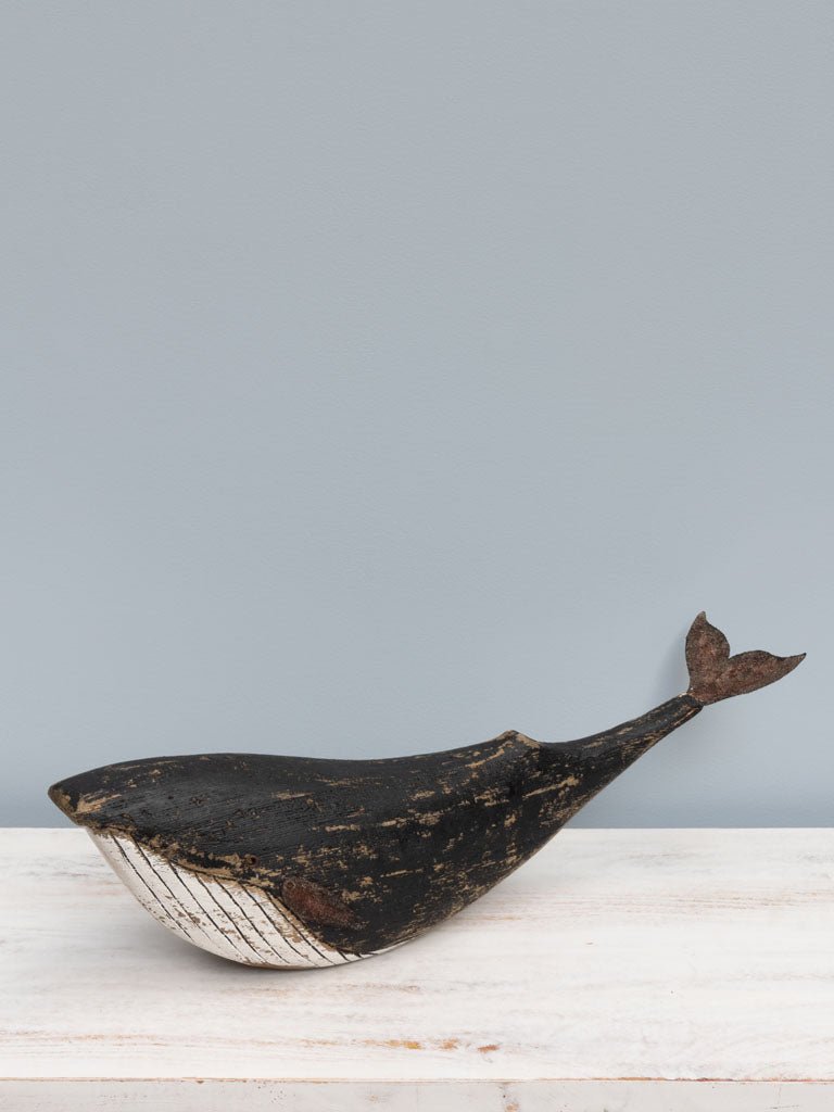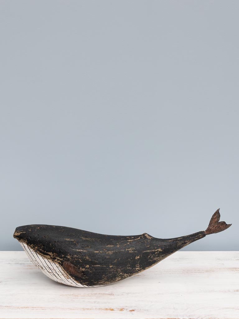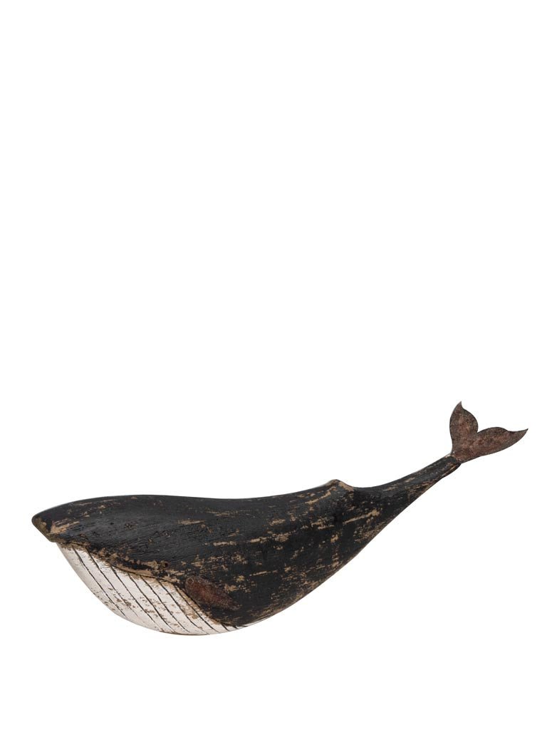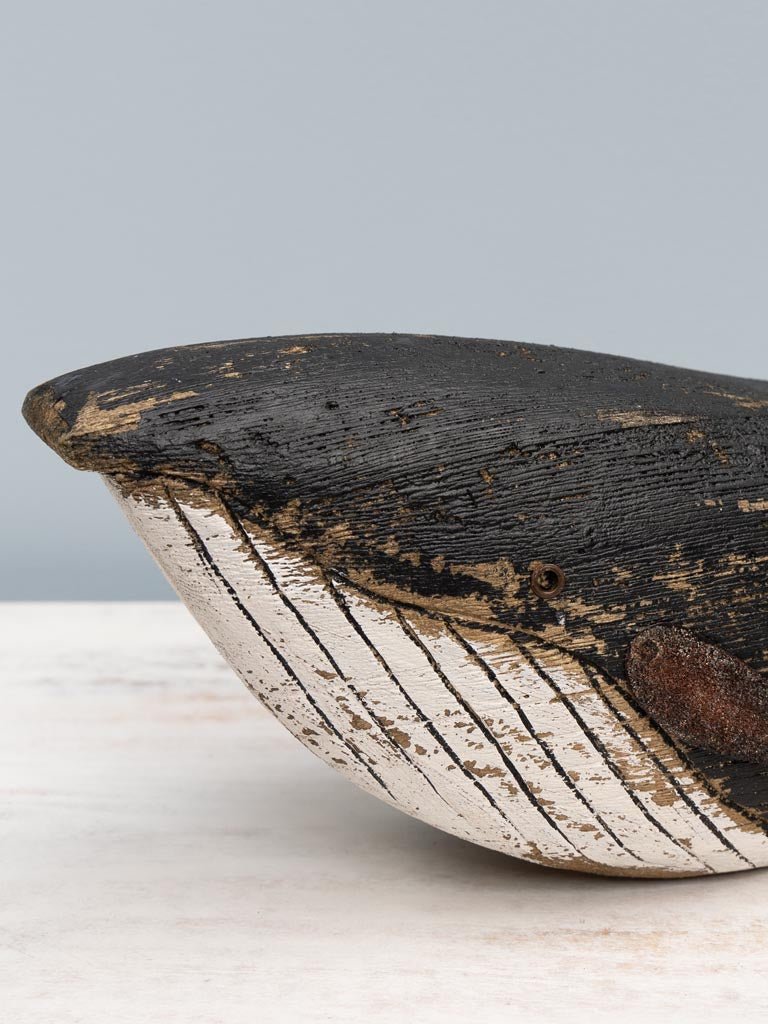 Preciosa figura decorativa en forma de ballena fabricada en madera de abeto y pintada de color blanco y negro.