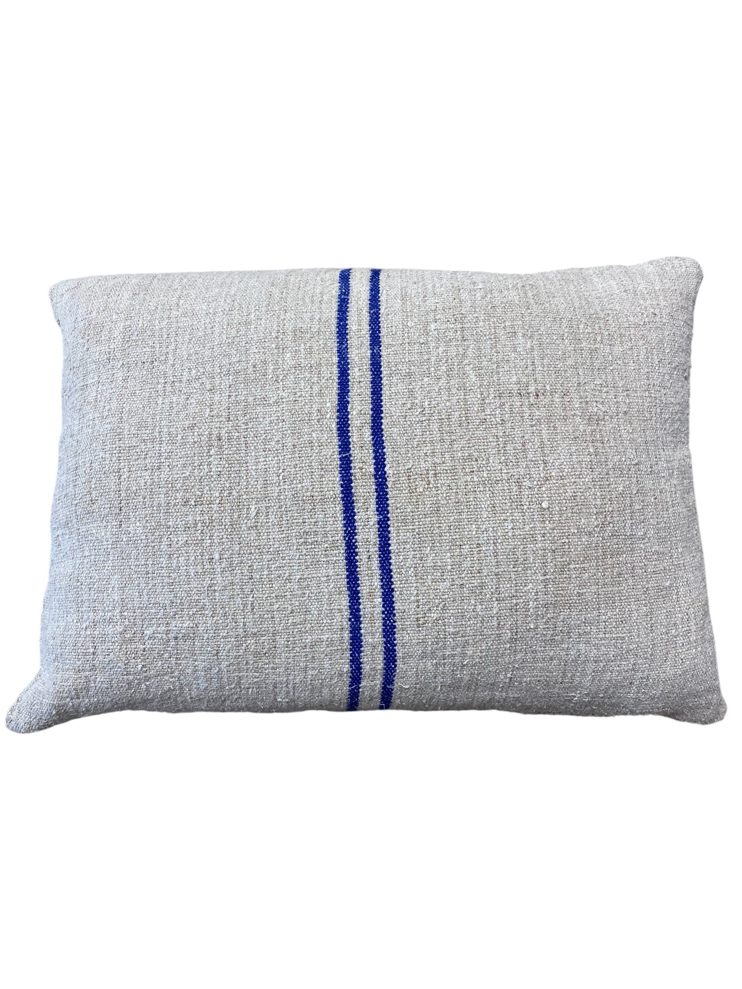 Funda de cojín de lino antiguo de los sacos de grano procedentes de las antiguas granjas de Centroeuropa. Detalle de franjas verticales en color azul. El tono y la medida de alguna de las fundas puede variar algún centímetro arriba o abajo en función del saco usado para la confección.