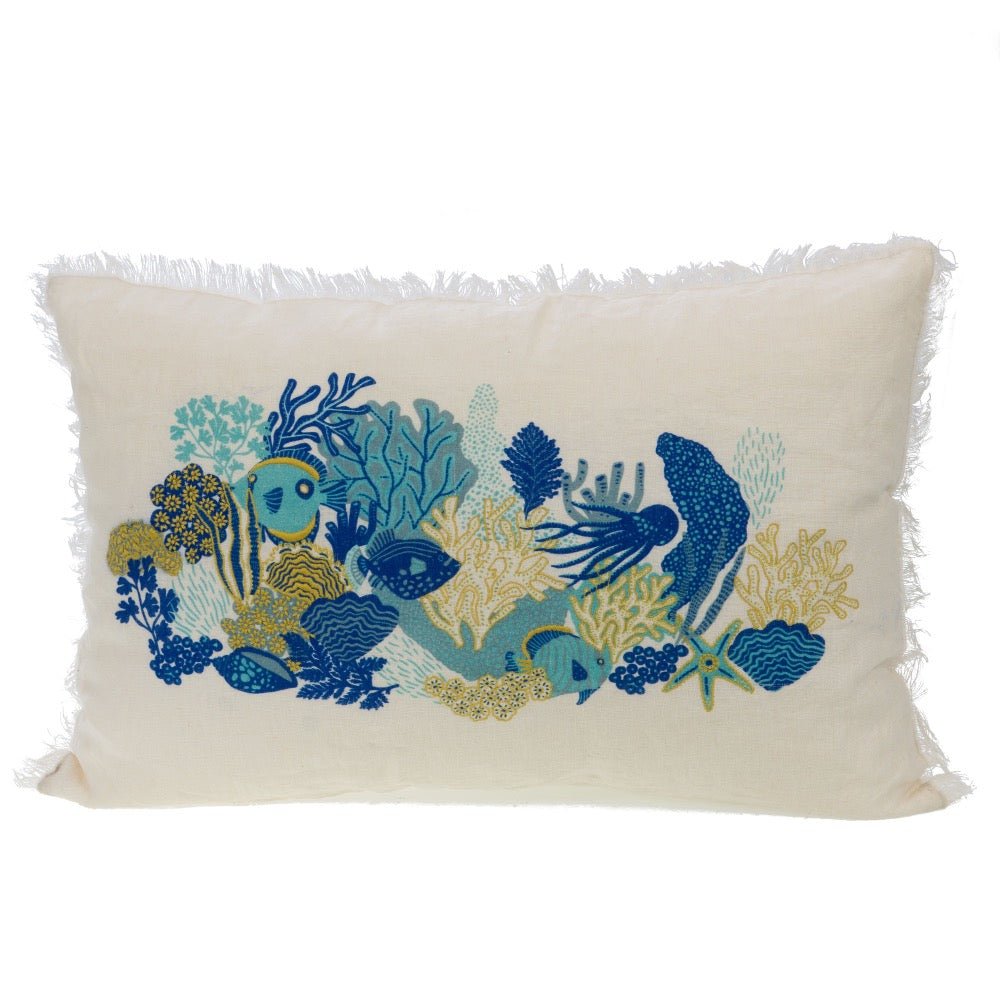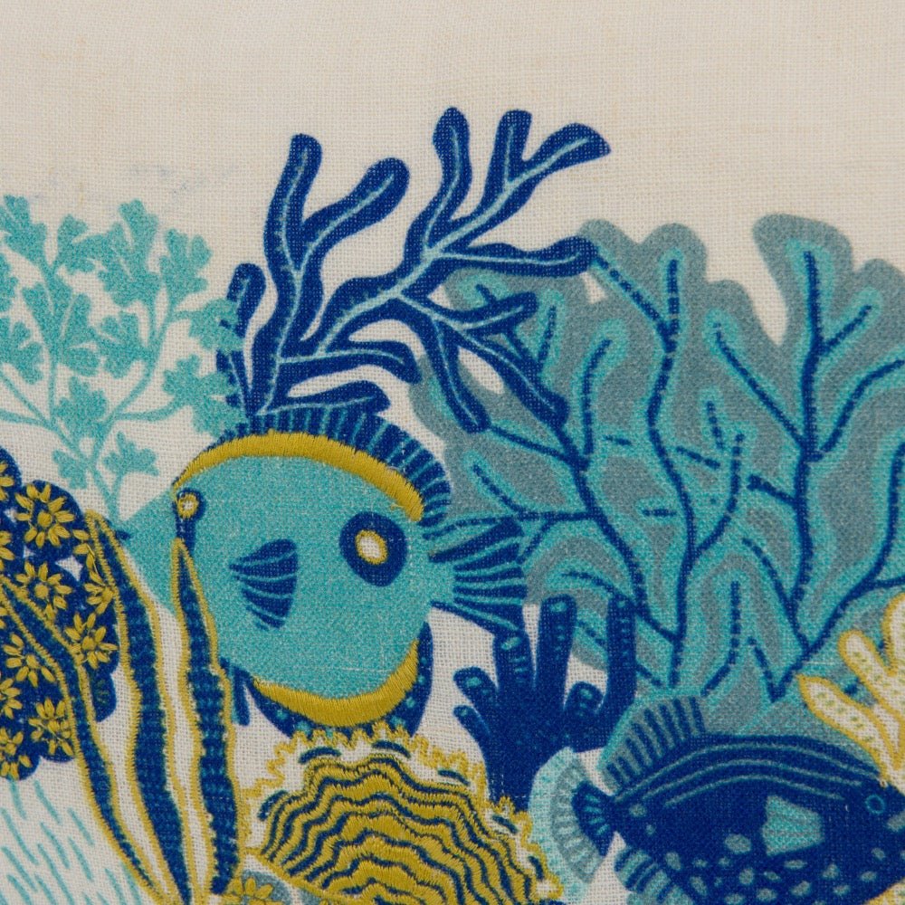 Esta elegante funda de cojín está confeccionada en lino blanco natural, que aporta frescura y sofisticación a cualquier espacio. Destaca por sus delicados dibujos bordados a mano con motivos marinos en tonos azul profundo, que evocan la tranquilidad y belleza del océano. Perfecta para dar un toque costero y artesanal a tu sala o dormitorio, combina confort y estilo con un diseño atemporal.