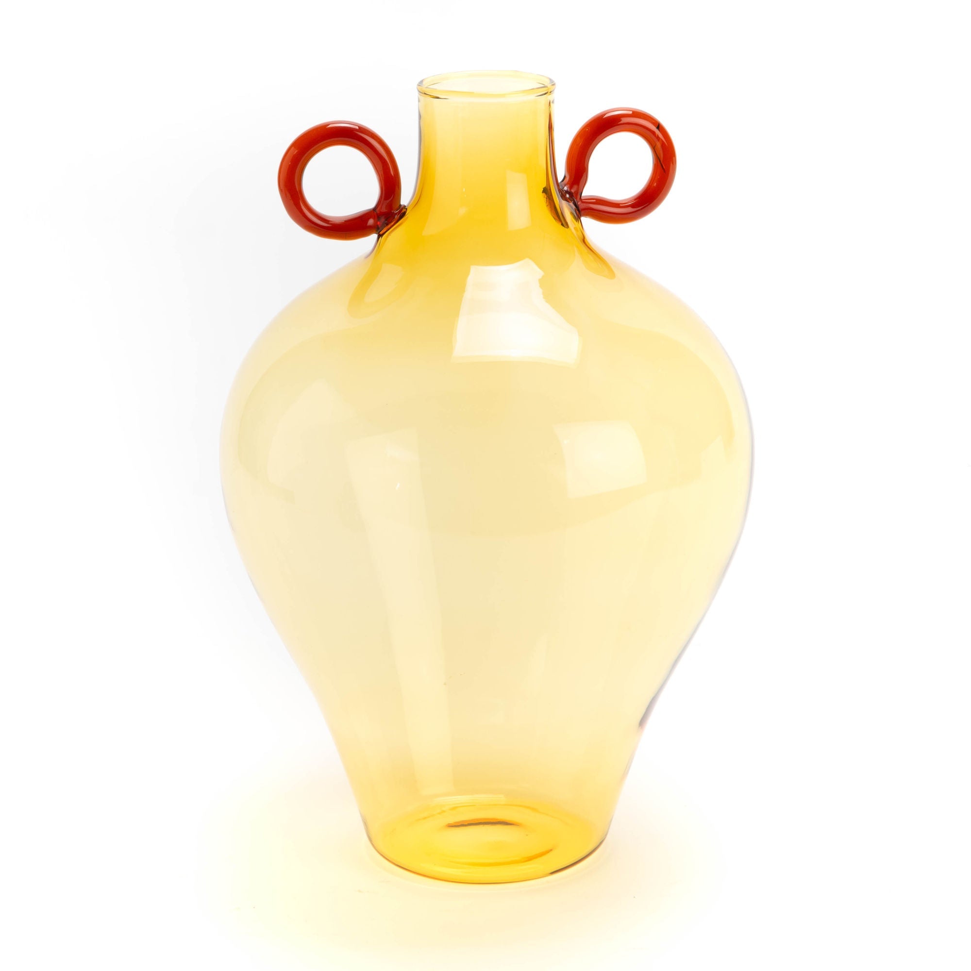 Precioso jarrón pequeño con dos asas fabricado en vidrio en color amarillo.