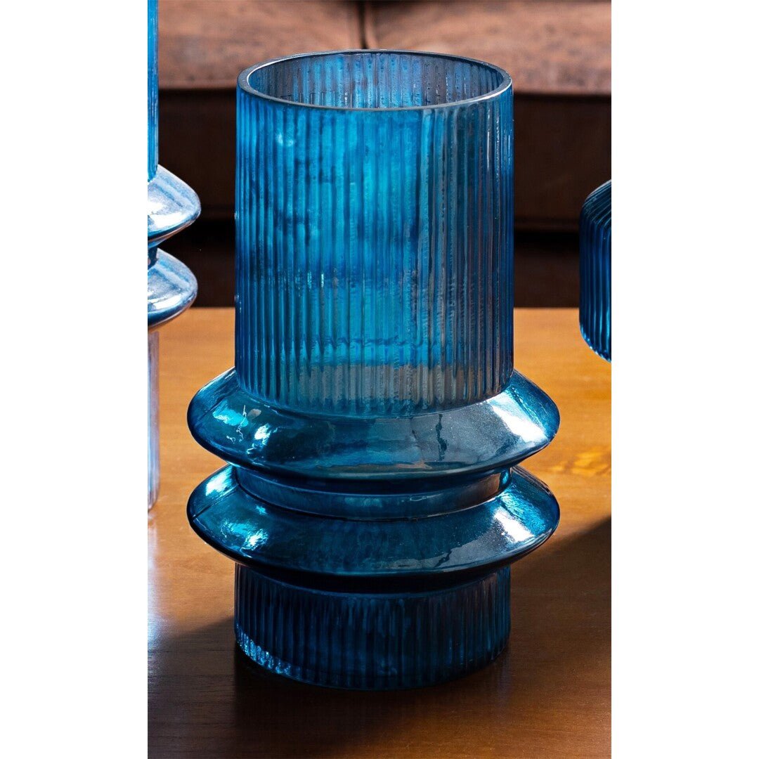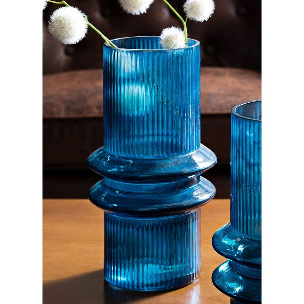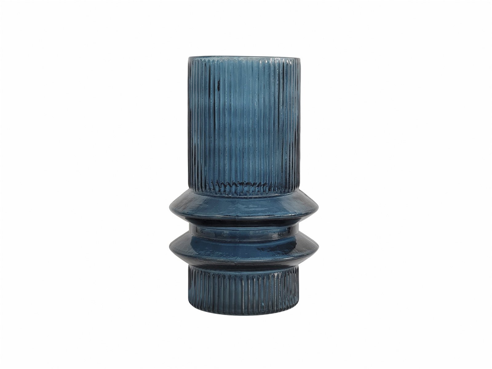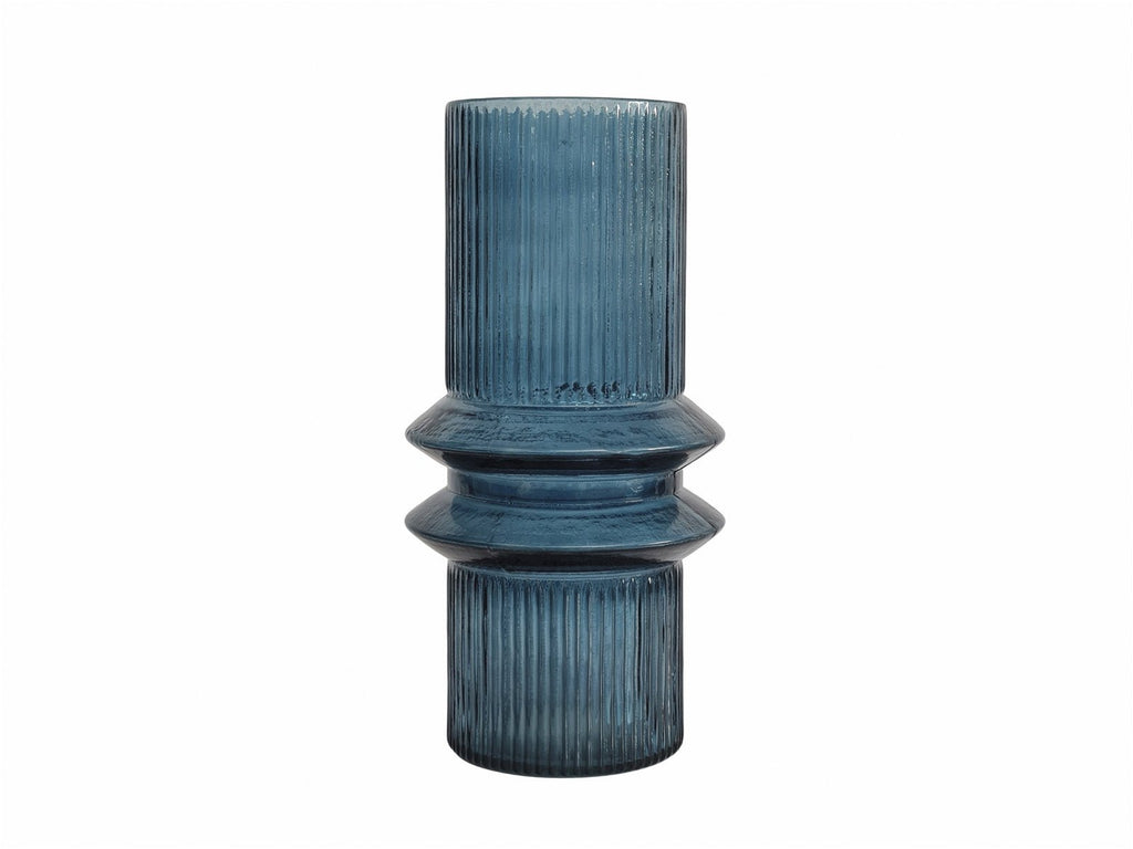 Precioso jarrón cilíndrico fabricado en vidrio de color azul. Disponible en dos medidas.
