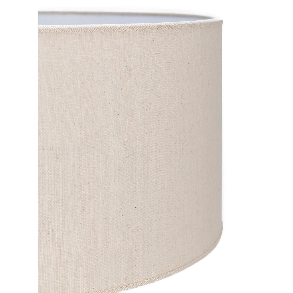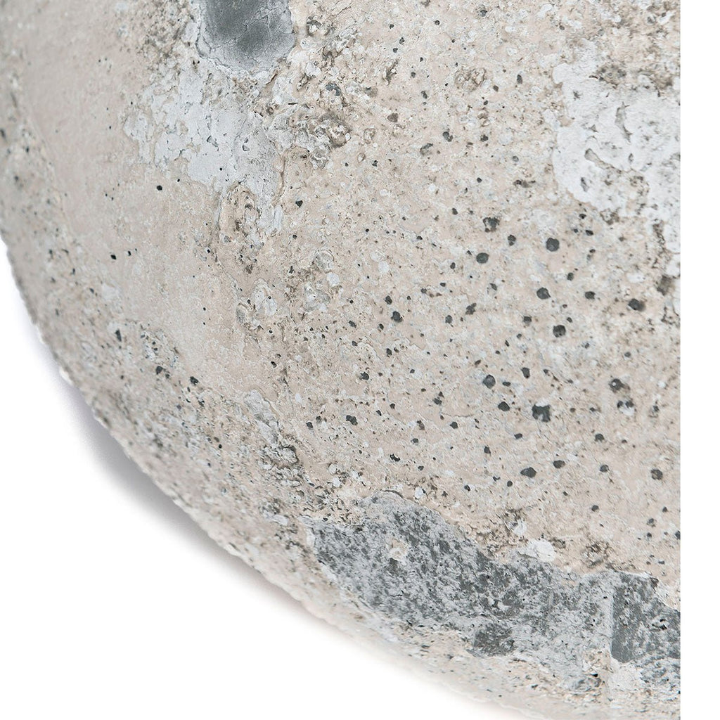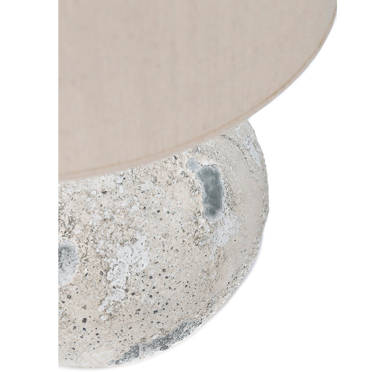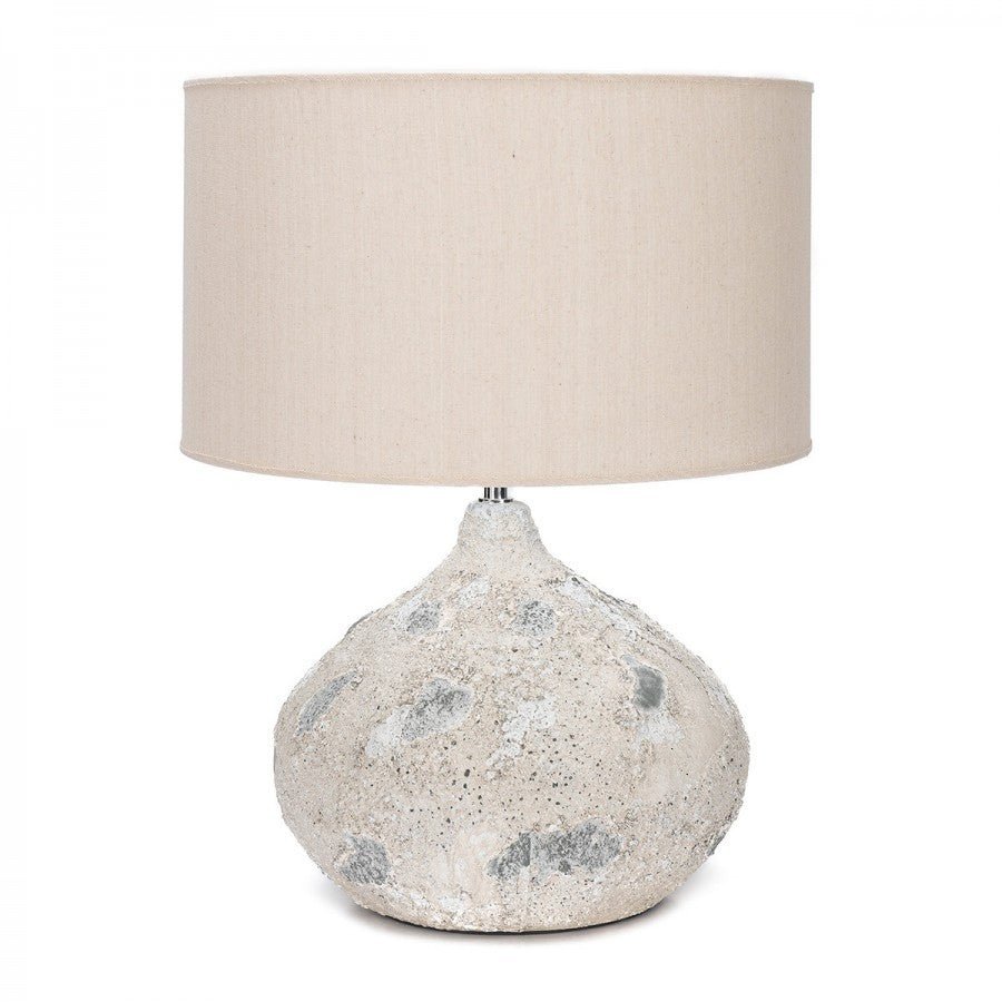 Lámpara de sobremesa con base fabricada en cemento compuesto en tonos grises y crema y pantalla no incluida.