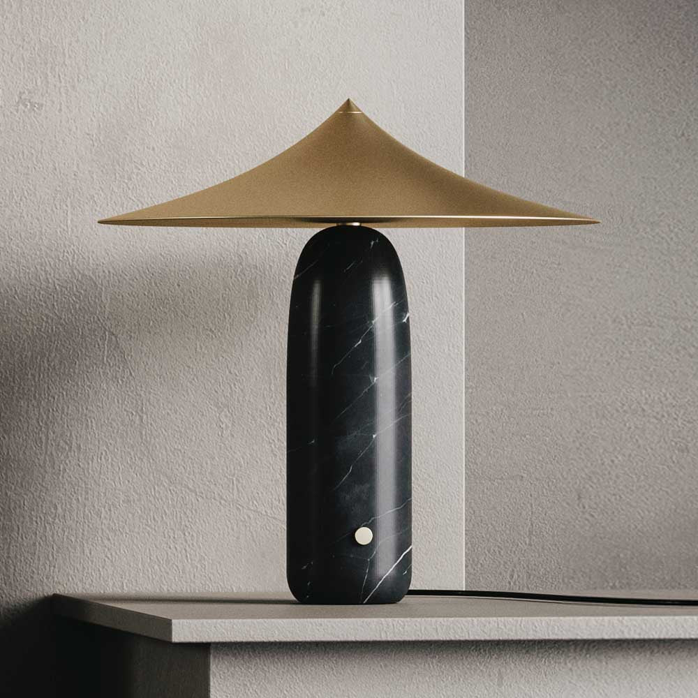 Lámpara de sobremesa de diseño con base de mármol disponible en dos colores: blanco y negro. Puede combinarse con pantalla cónica de metal en color negro mate texturizado y blanco mate texturizado.
