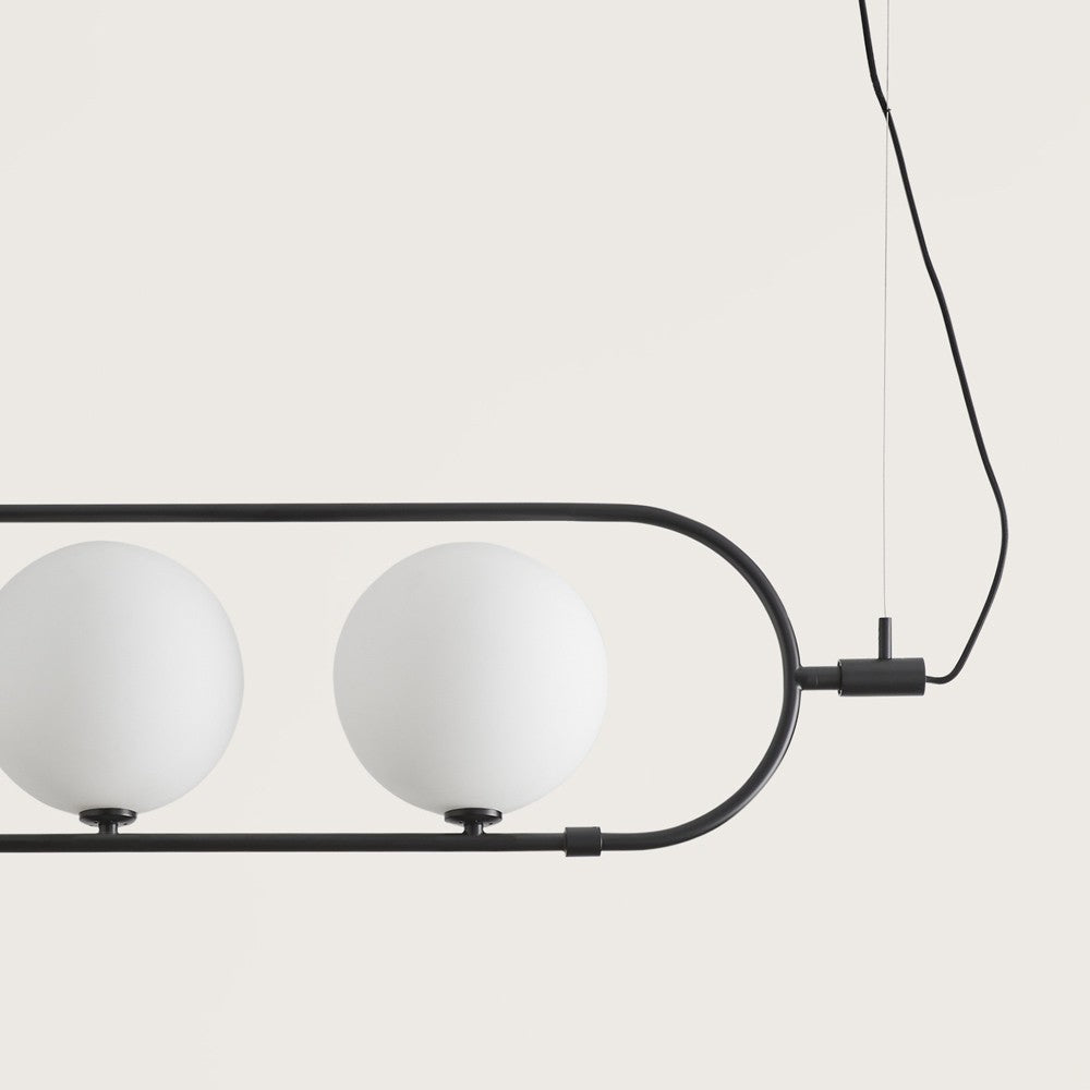 Lámpara de techo de diseño fabricada en acero y vidrio soplado con altura regulable. Las tulipas, que están incluidas, son de cristal opal o transparente, y el cuerpo de acero está disponible en color negro mate y oro mate.