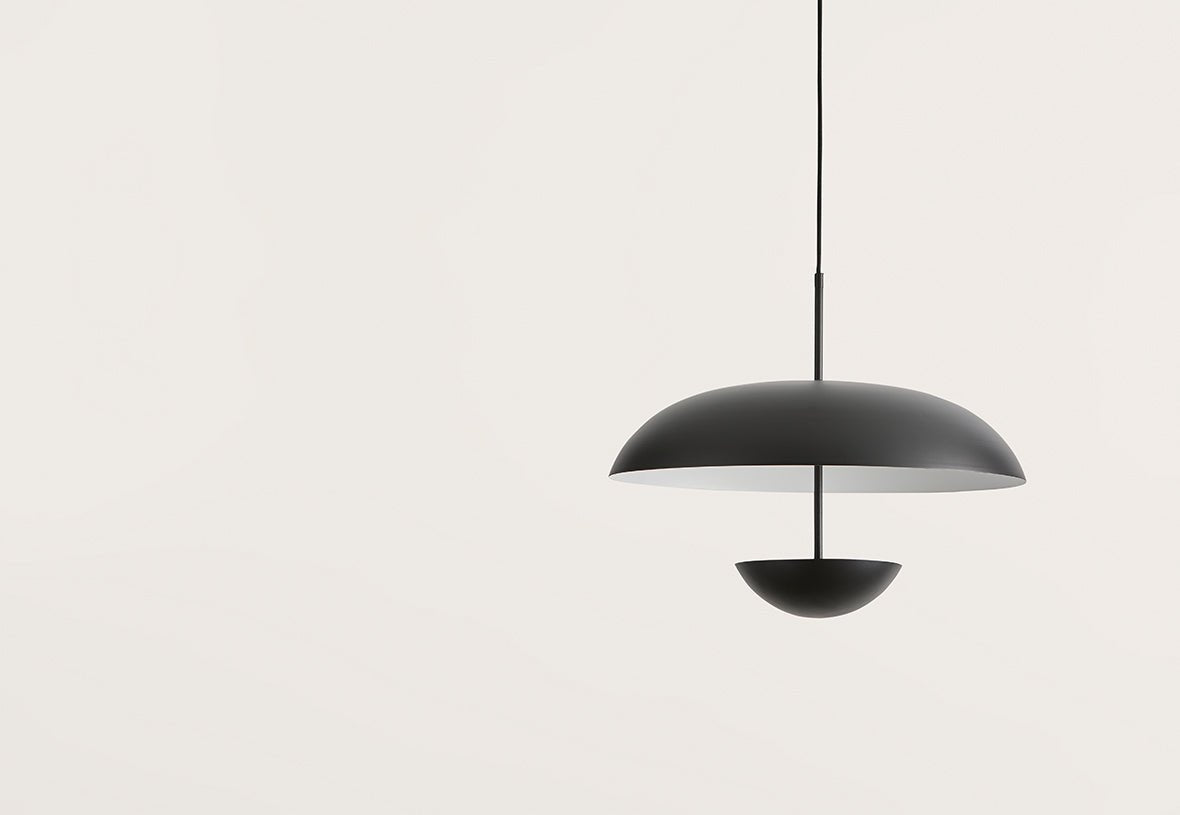Cuenta con dos pantallas muy decorativas. La cúpula grande es negro mate en el exterior y blanco mate en el interior. El difusor inferior puede ser negro mate u oro mate.