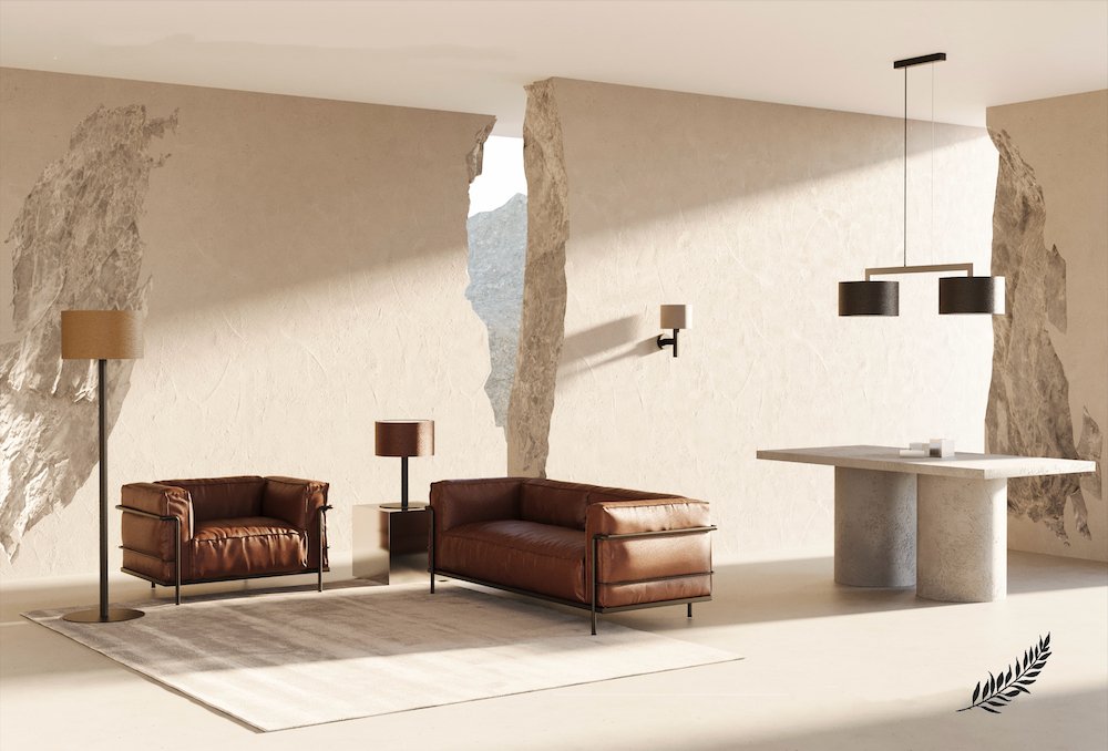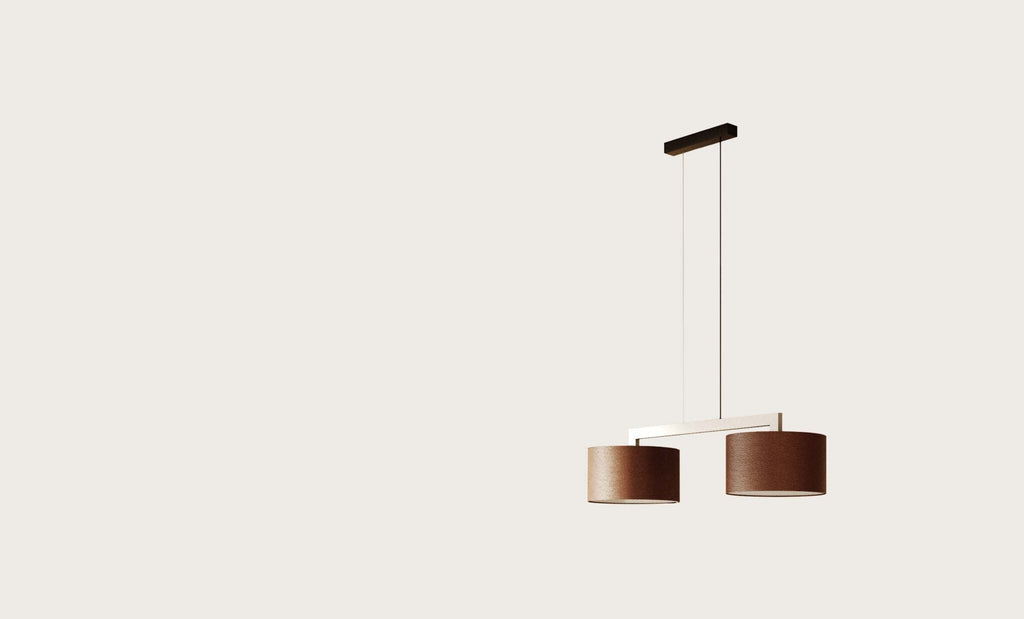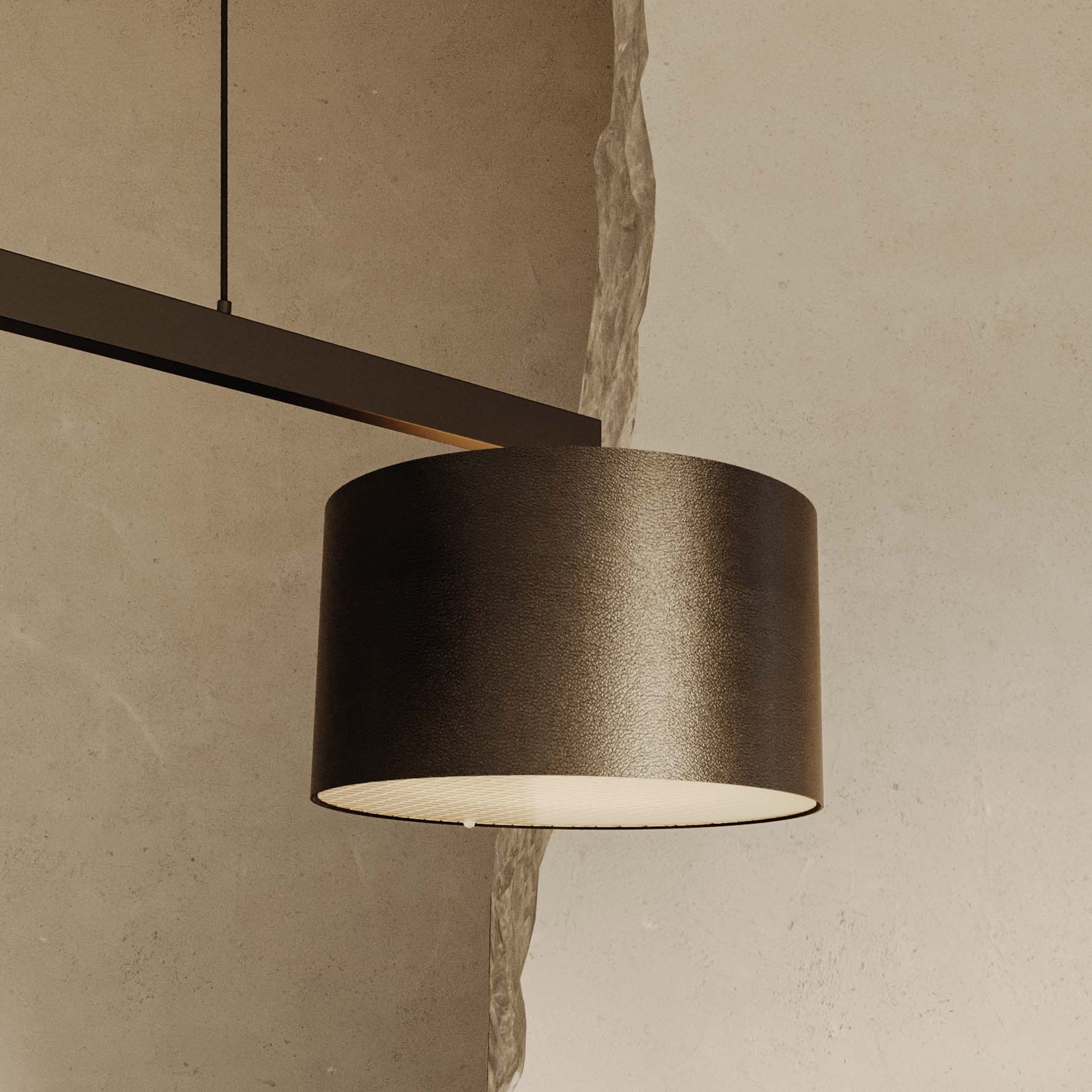 Lámpara de techo de diseño colgante con estructura de acero en color negro mate y pantallas de cuero en varios posibles colores.