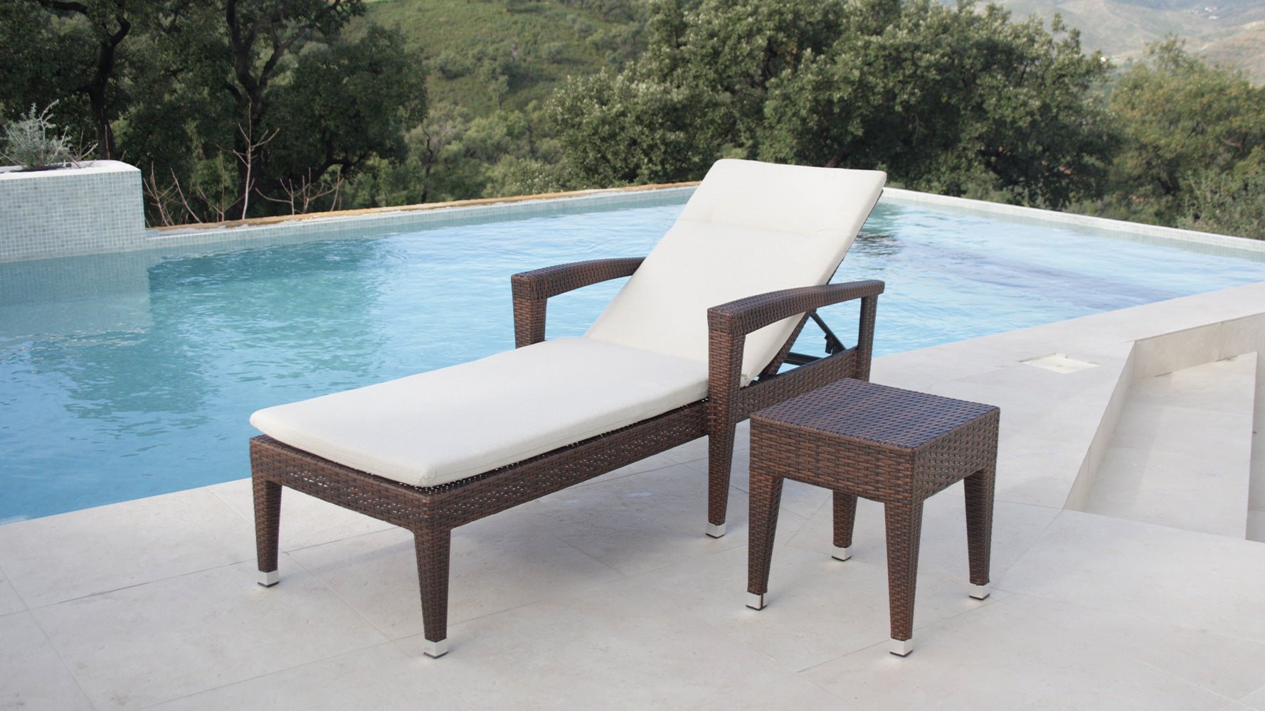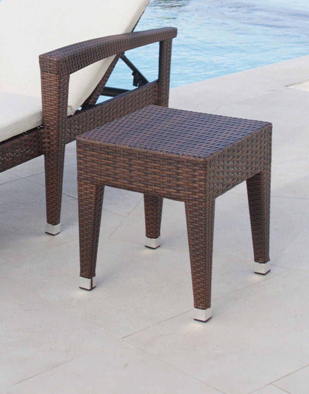 Mesa auxiliar de exterior fabricada en fibra sintética en color marrón con detalles en aluminio.