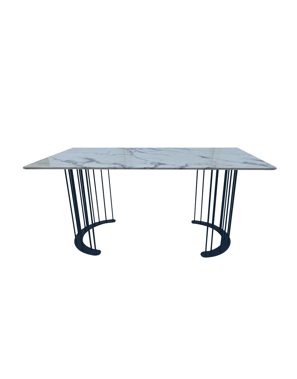 Mesa con tablero fabricado en piedra imitación mármol y patas de acero de color negro.