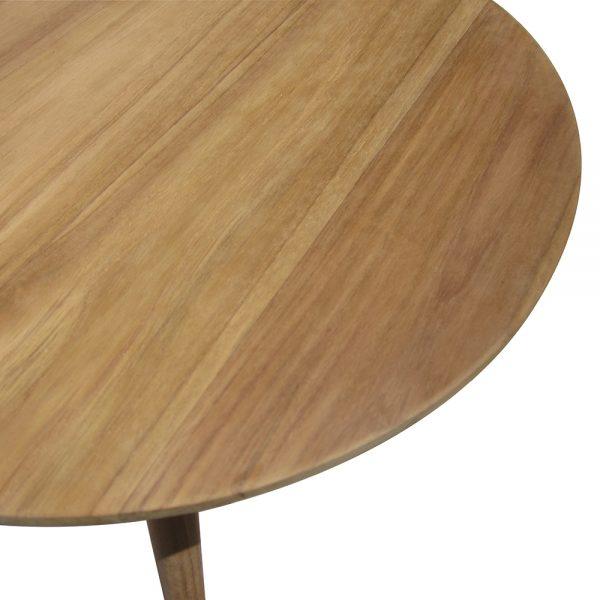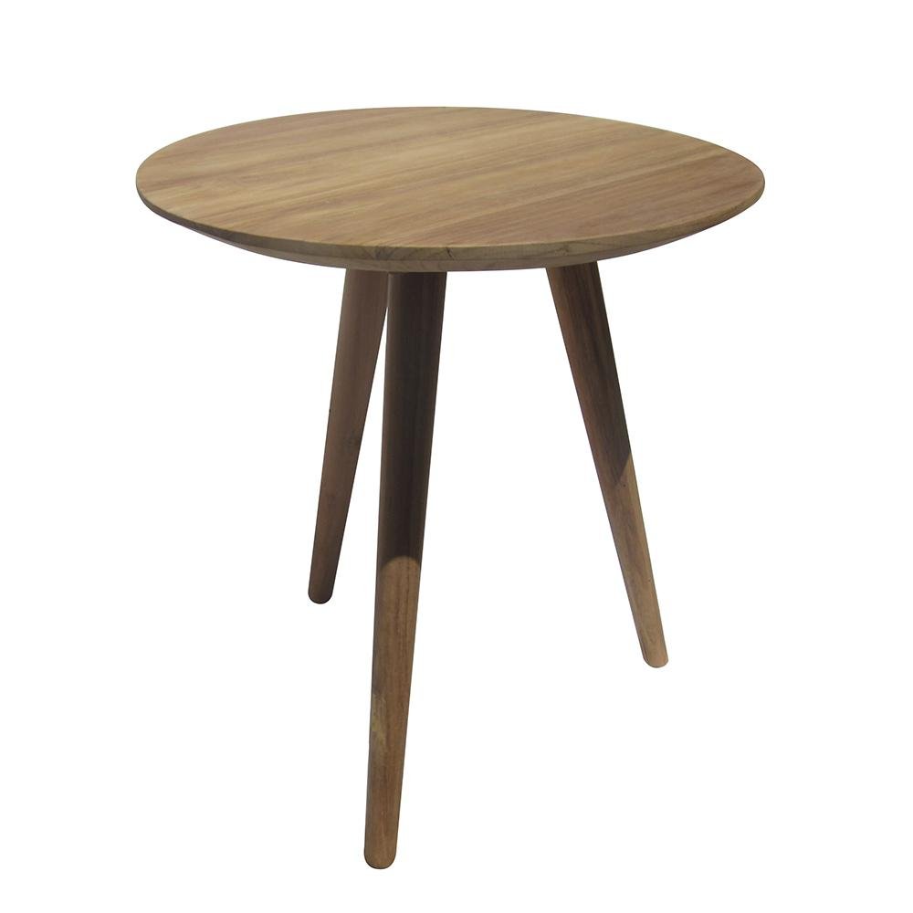 Mesa auxiliar redonda de madera de teca color natural. No requiere montaje.