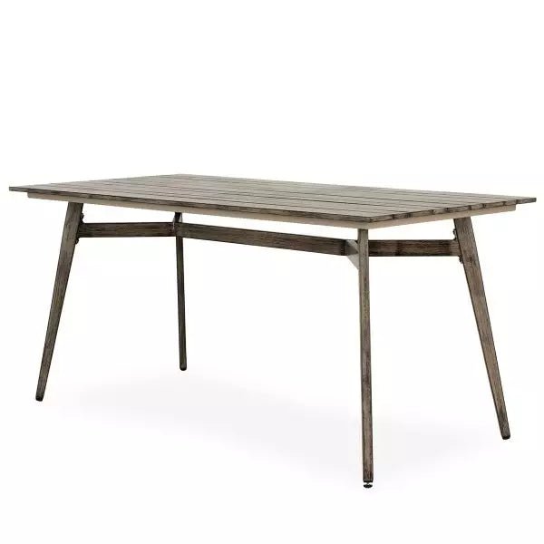 Mesa de comedor Guadalupe, perfecta para terrazas y porches, fabricada en un original diseño en aluminio con patas ligeramente inclinadas y refuerzo para mayor estabilidad.