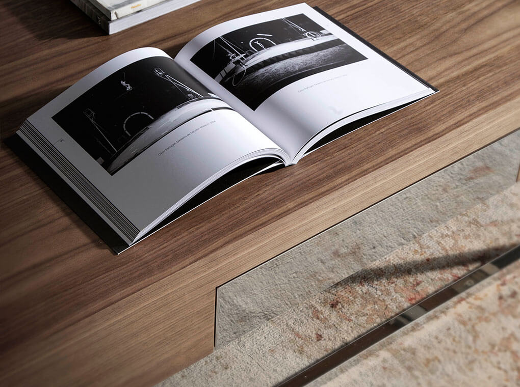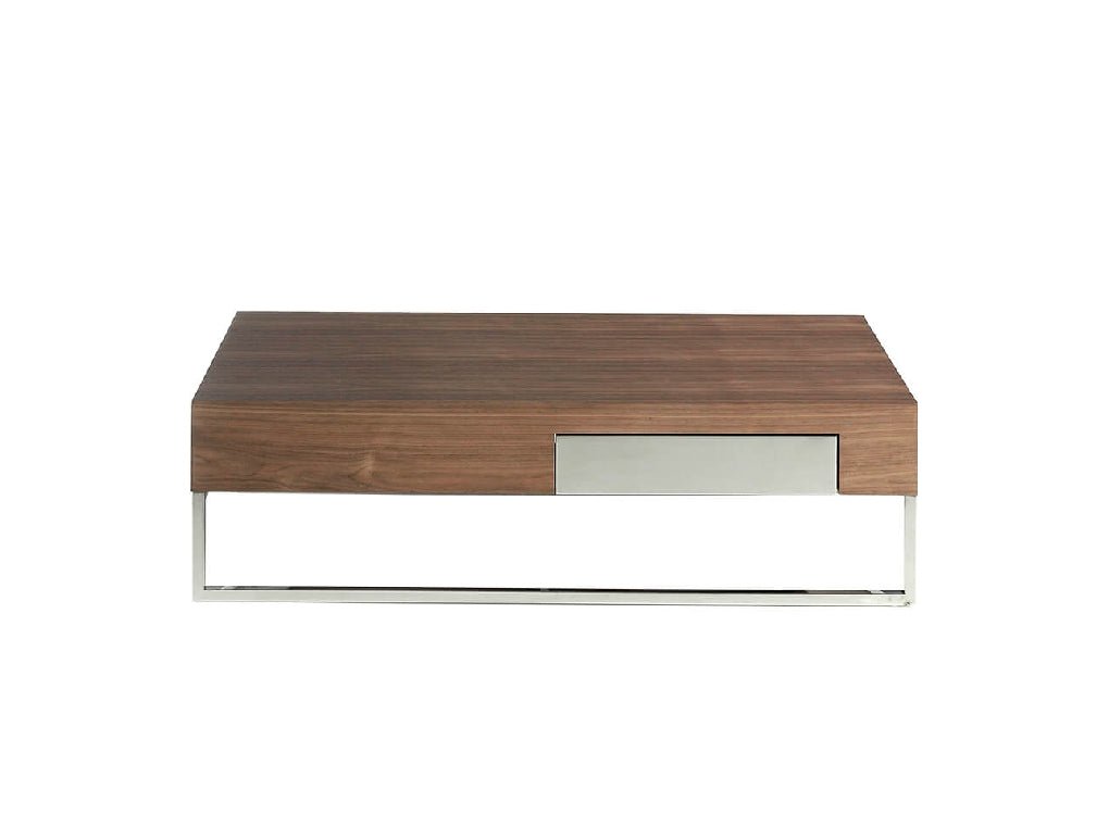 Mesa centro rectangular con tapa fija rectangular de madera chapada en nogal natural y un cajón frontal con acabado cromado con estructura de patas en acero inoxidable cromado.