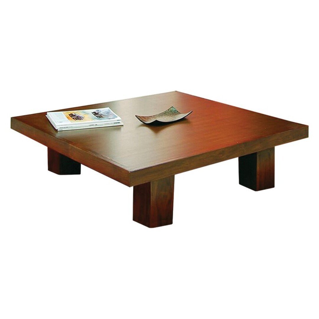 Mesa de centro de líneas rectas fabricada en madera color marrón.